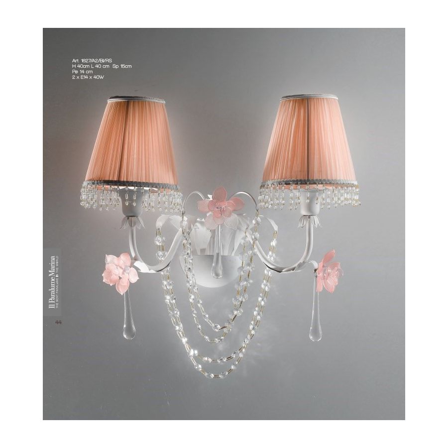 "Pearl" Collection: 2 lights Wall Lamp in white metal with pink Murano glass roses, clear drops and crystals. Lampshades are made in pink silk and ivory chiffon. Lighting item that diffuses the light with great effect in the surrounding environement creating a warm and welcoming atmosphere.