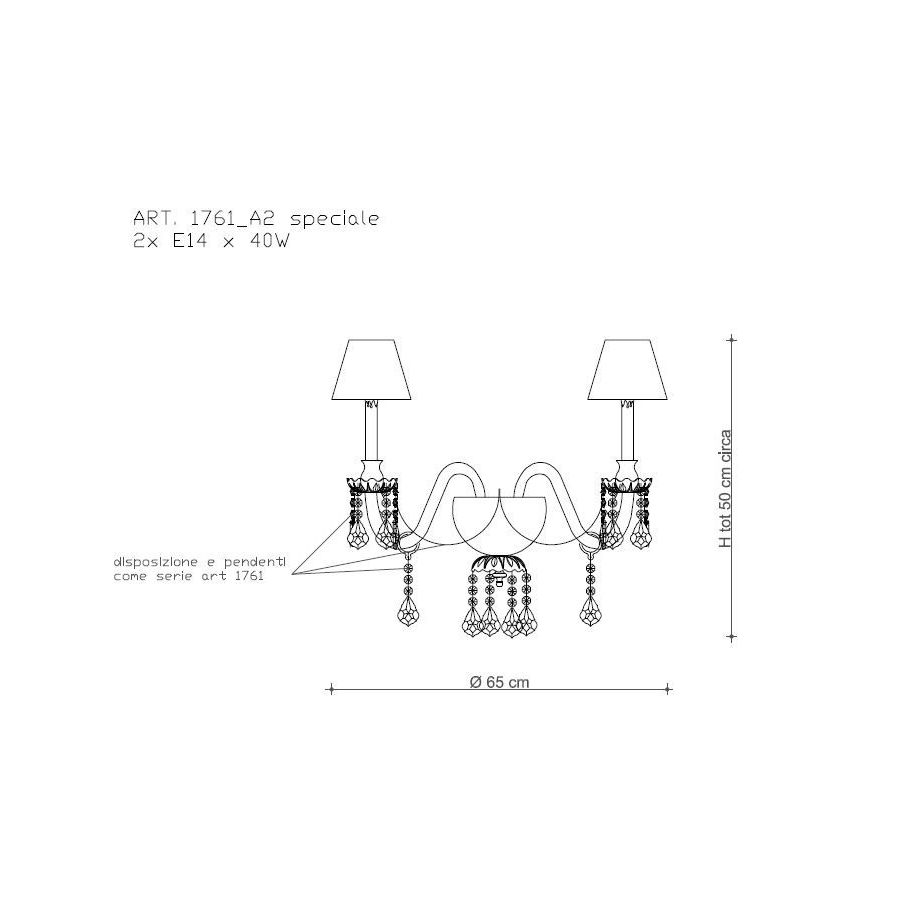 Wall lamp in glass and crystal with pendents complete with lampshades. Lighting item that diffuses the light with great effect in the surrounding environement creating a warm and welcoming atmosphere.