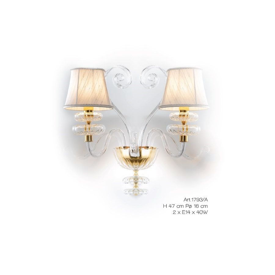 "Amarillis" Collection: Wall lamp in clear Murano glass with light ivory lampshades in double fabric with crystal trimming. Lighting item that diffuses the light with great effect in the surrounding environement creating a warm and welcoming atmosphere.