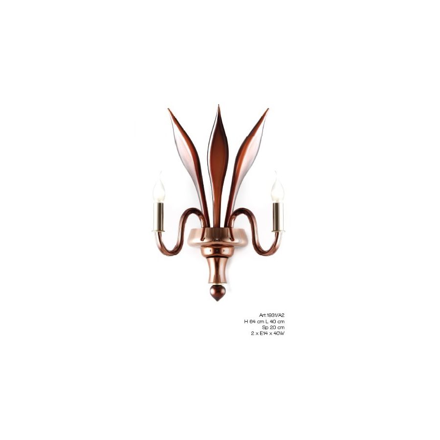 2 lights Wall lamp in "Caffè" Murano glass+ mirror effect. Lighting item that diffuses the light with great effect in the surrounding environement creating a warm and welcoming atmosphere.