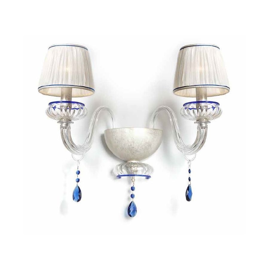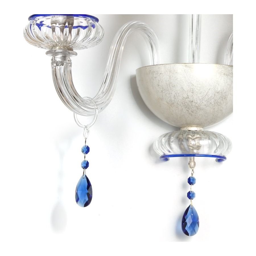 Murano Glass wall sconce transparent with Blue decoration and Swarovsky Elements. Lighting item that diffuses the light with great effect in the surrounding environement creating a warm and welcoming atmosphere.