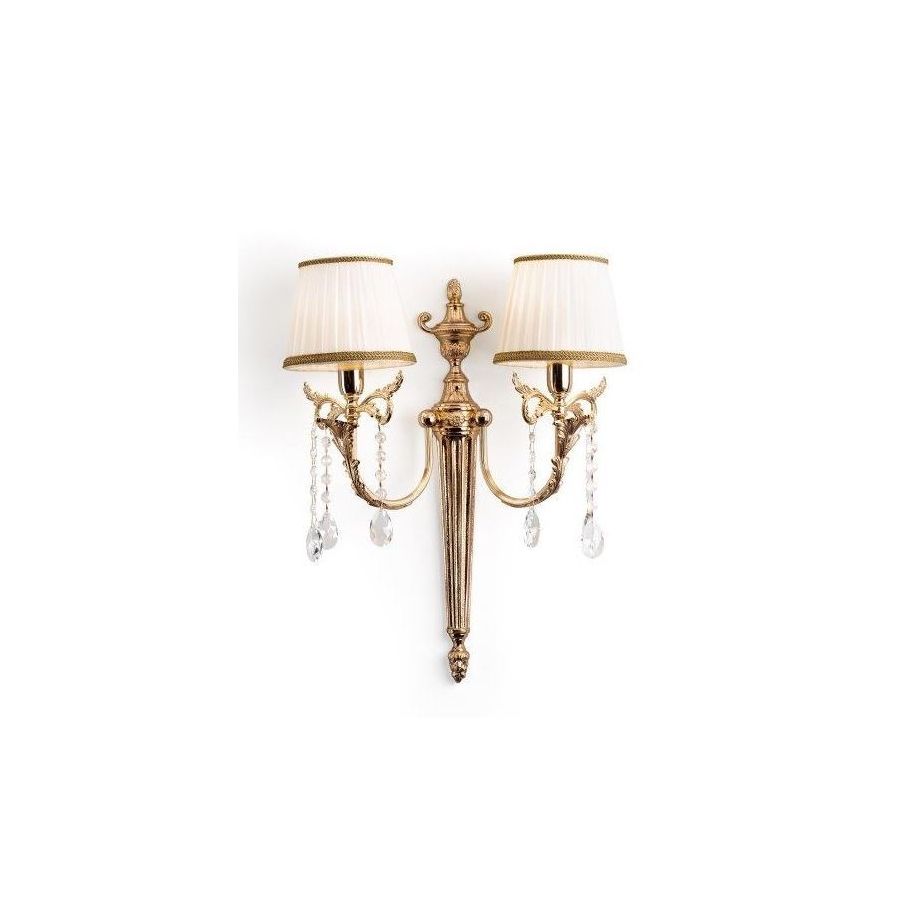 Wall lamp in cast brass with lampshades and crystal pendants. Lighting item that diffuses the light with great effect in the surrounding environement creating a warm and welcoming atmosphere.