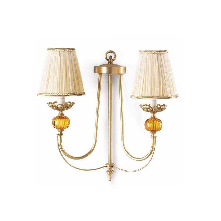 Wall lamp 2 lights in brass with inserts of amber Murano glass and fabric lampshades. Lighting item that diffuses the light with great effect in the surrounding environement creating a warm and welcoming atmosphere.