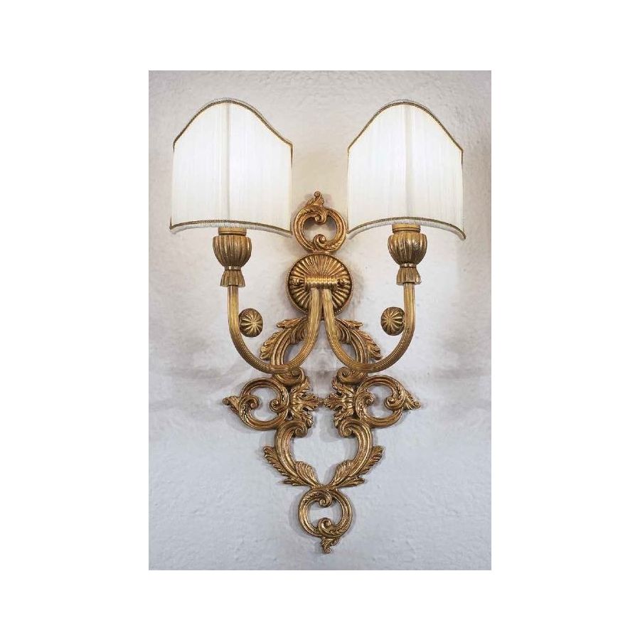 Wall lamp 2 lights in cast brass with fabric lampshades. Lighting item that diffuses the light with great effect in the surrounding environement creating a warm and welcoming atmosphere.