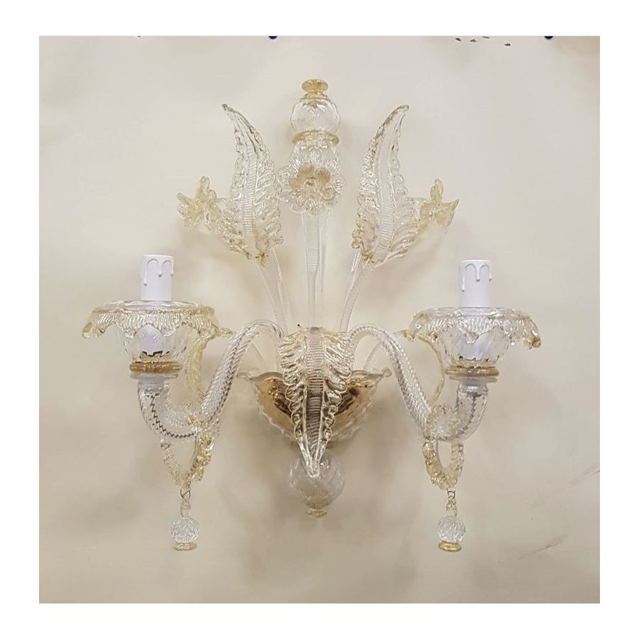 2 lights transparent wall light with pure gold decoration. Lighting fixture that diffuses the light into the surrounding environment with great effect, creating a warm and welcoming atmosphere.