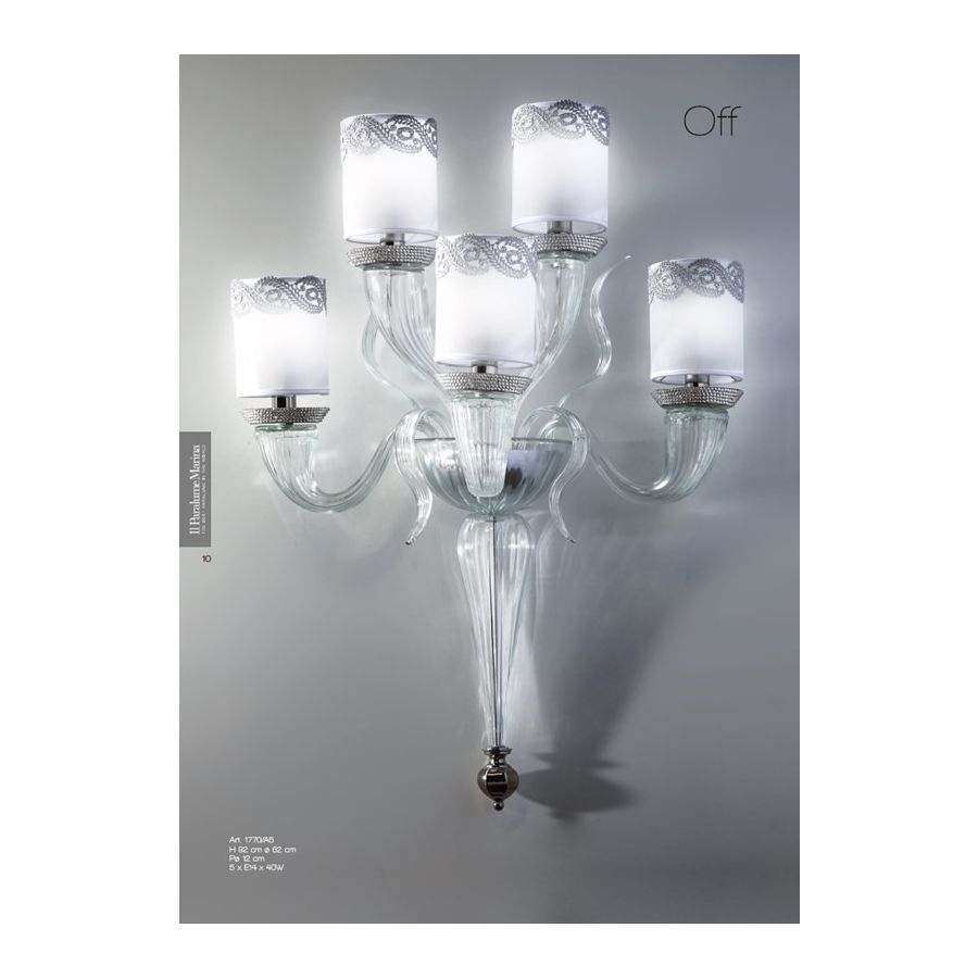 NINFEA Collection 5 lights Wall lamp in Murano glass with brass elements inlaid with Swarovski® strass crystals. Included lampshades in white organza with fabric trimming. Lighting item that diffuses the light with great effect in the surrounding environement creating a warm and welcoming atmosphere.