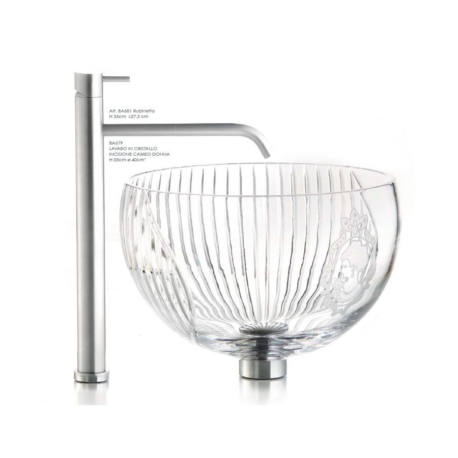 Washbasin in clear Italian crystal with hand-carved lady portrait cameo. Functional elements that create an extremely elegant, welcoming and high-value bathroom.