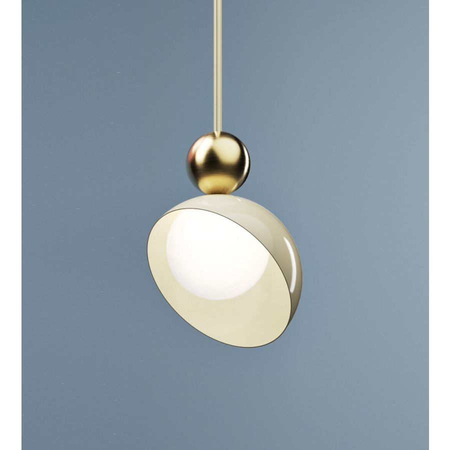 Aurora is a suspension with structure and decorative parts in metal available in Ancient White, Yellow Sunrise, Baby Blue, Baby Pink and Cappuccino. Middle sphere with brushed light gold finish. Diffuser in white glass.