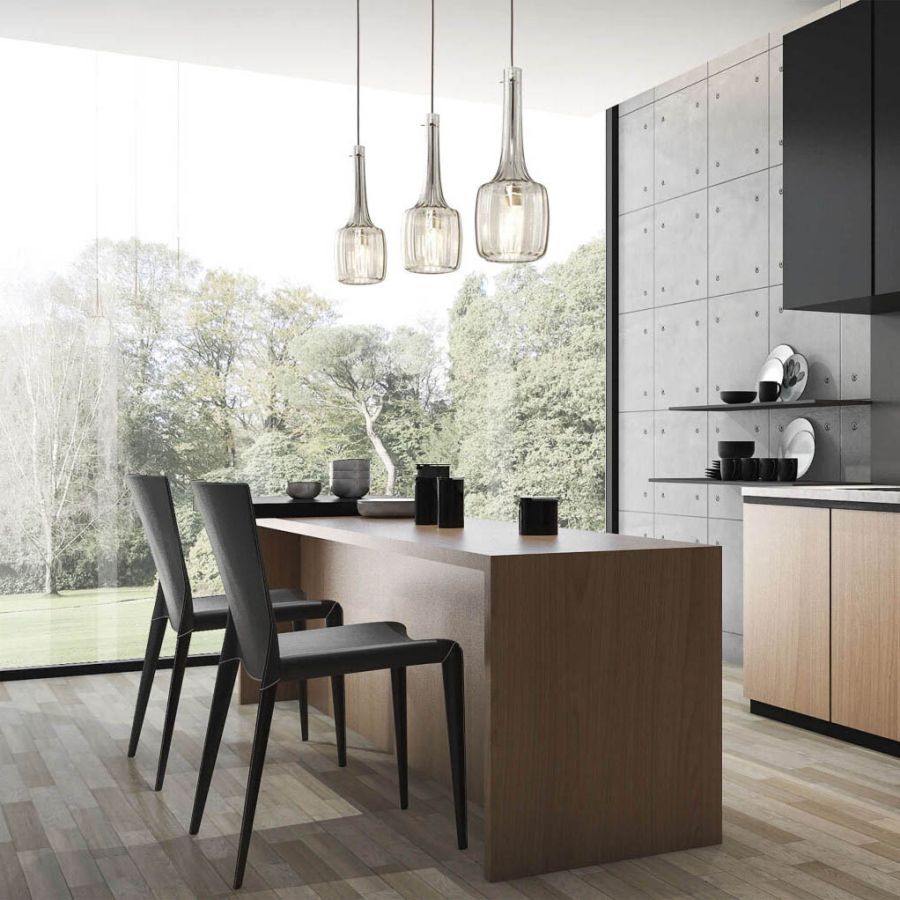 Bossanova glass pendant lamps composition brings an element of warmth to the cool tones of this modern room. Design Danilo De Rossi. Pendant lamp with blown glass diffusers available in four glass finishes and colours: transparent, fume, dove and olive green. Metal with iron grey finish.
