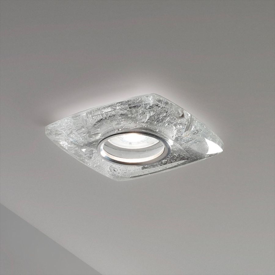 Spotlight in transparent or ambra glass with "Krek" effect. Internal metal ring in chrome finish.