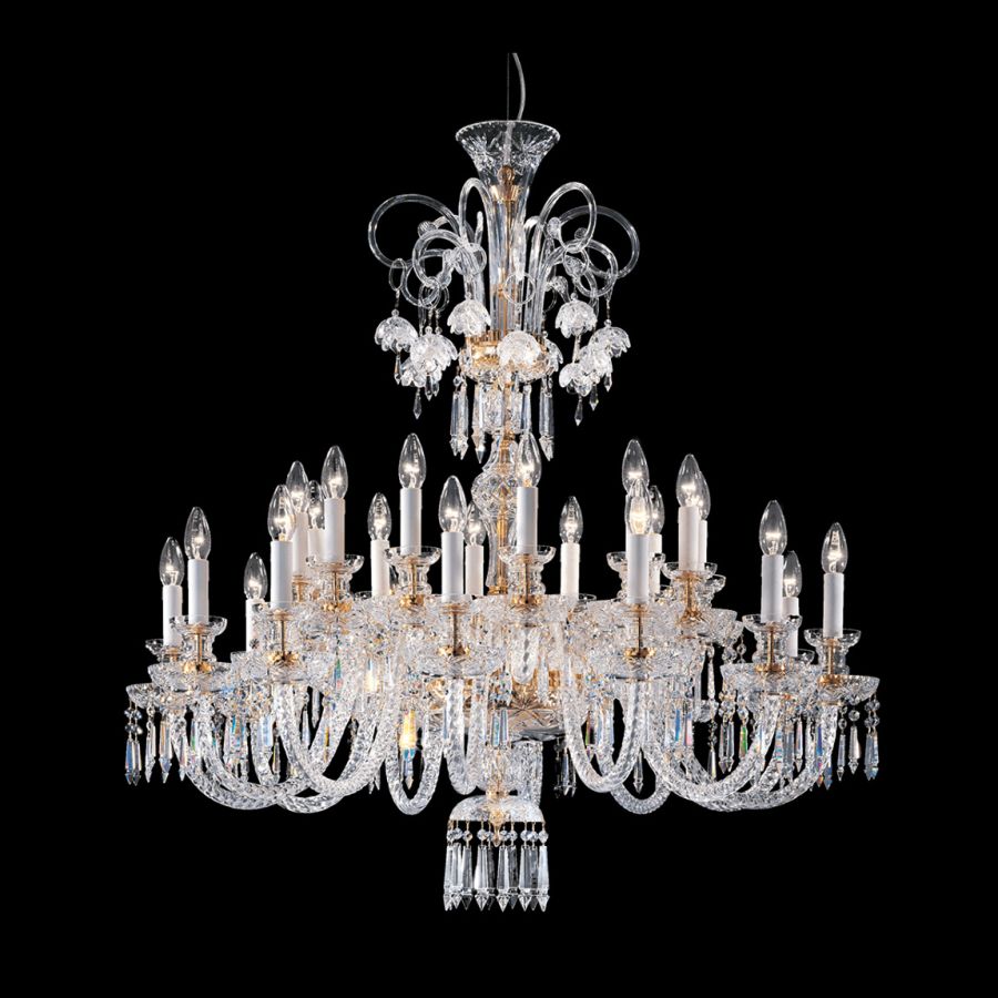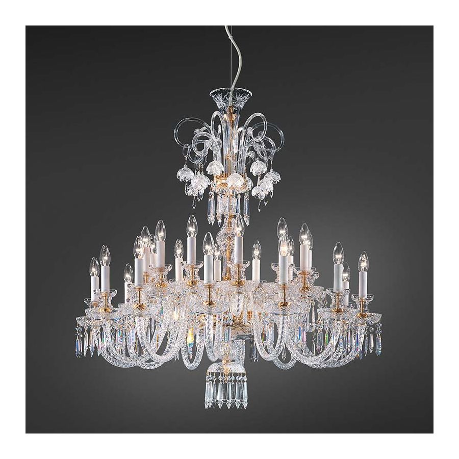 Chandelier in carved crystal and glass, metal with gold finish, Swarovski elements pendants and decorative glass flowers.