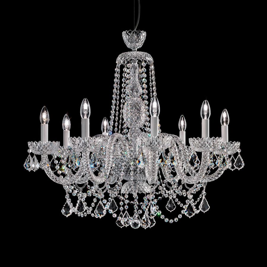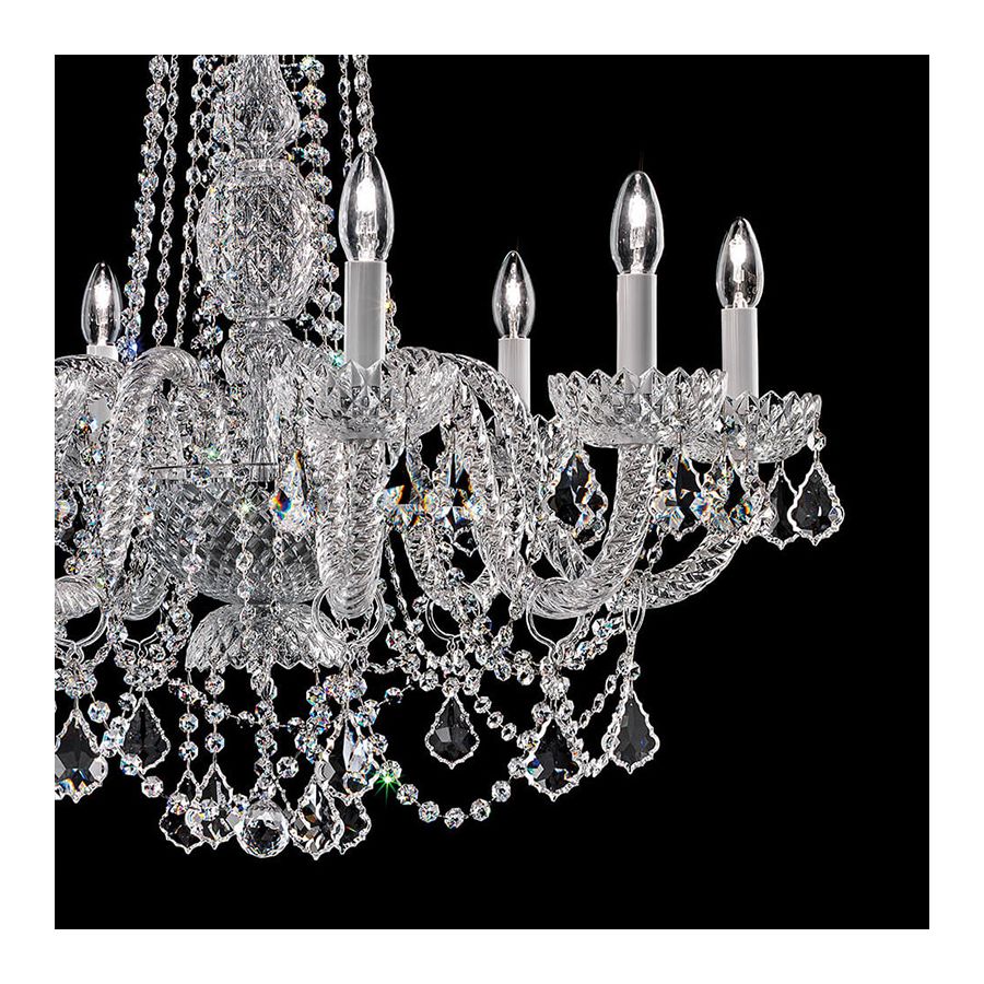 Chandelier in carved crystal, metal with chrome finish, Swarovski elements pendants.