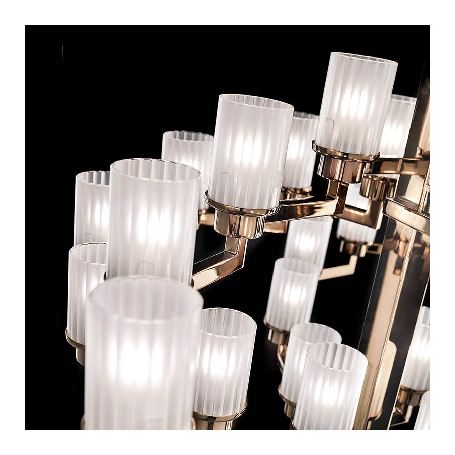 Chandelier in brushed chrome or gold nickel metal finish with satin glass diffusers. Artù is a suspension with a geometric metal structure characterized by a series of arms with lampshades in acid-etched glass.