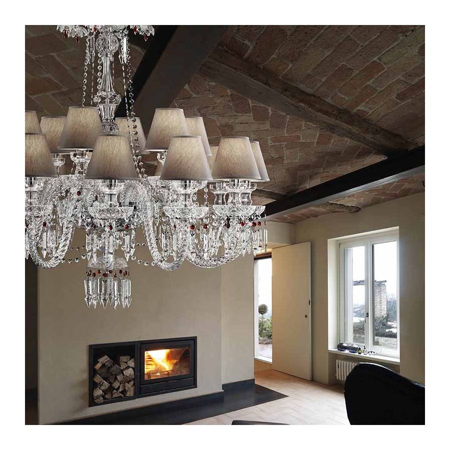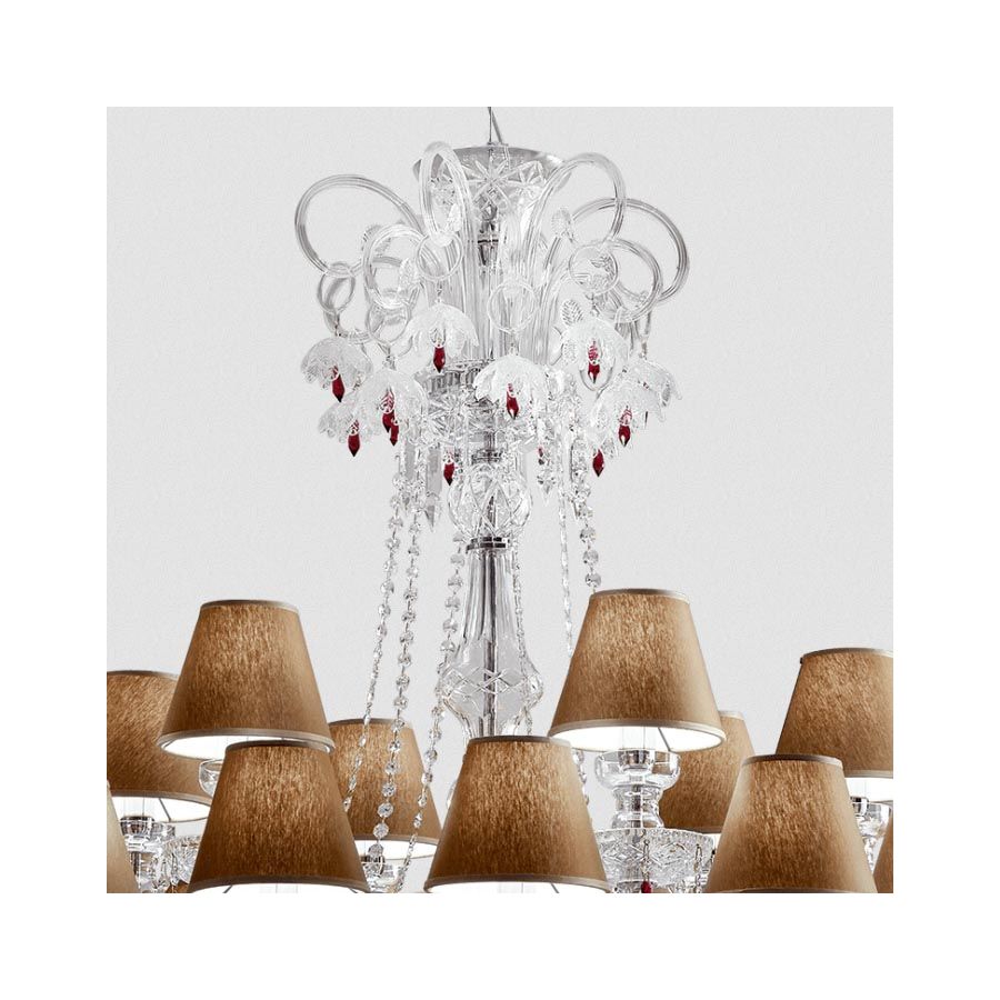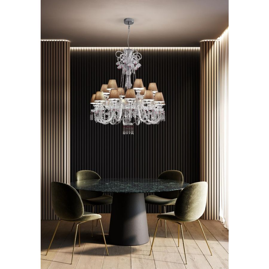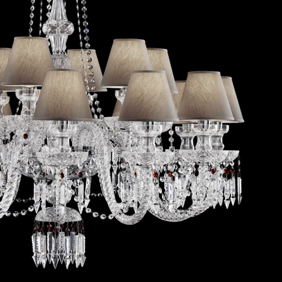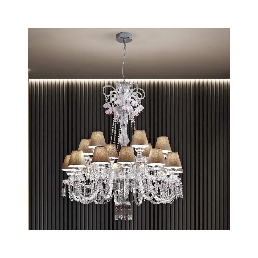Chandelier in carved crystal and glass, metal with chrome finish, dove fabric shades. Swarovski elements pendants.
