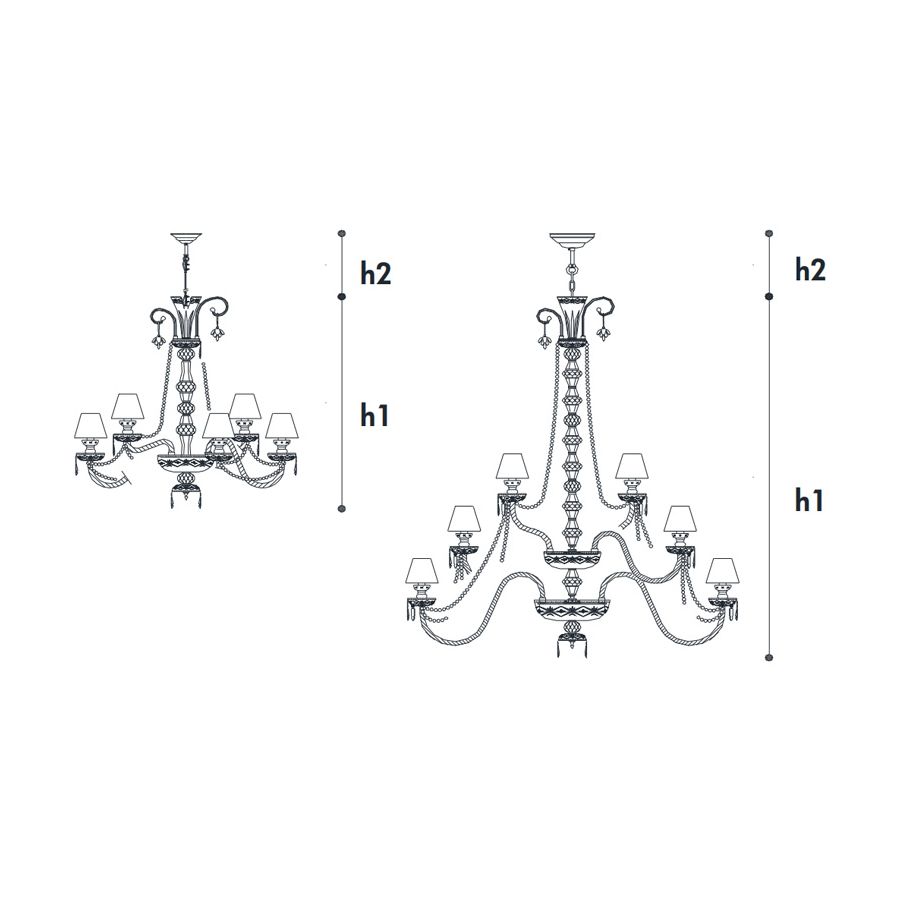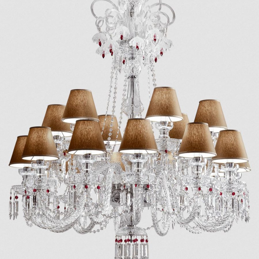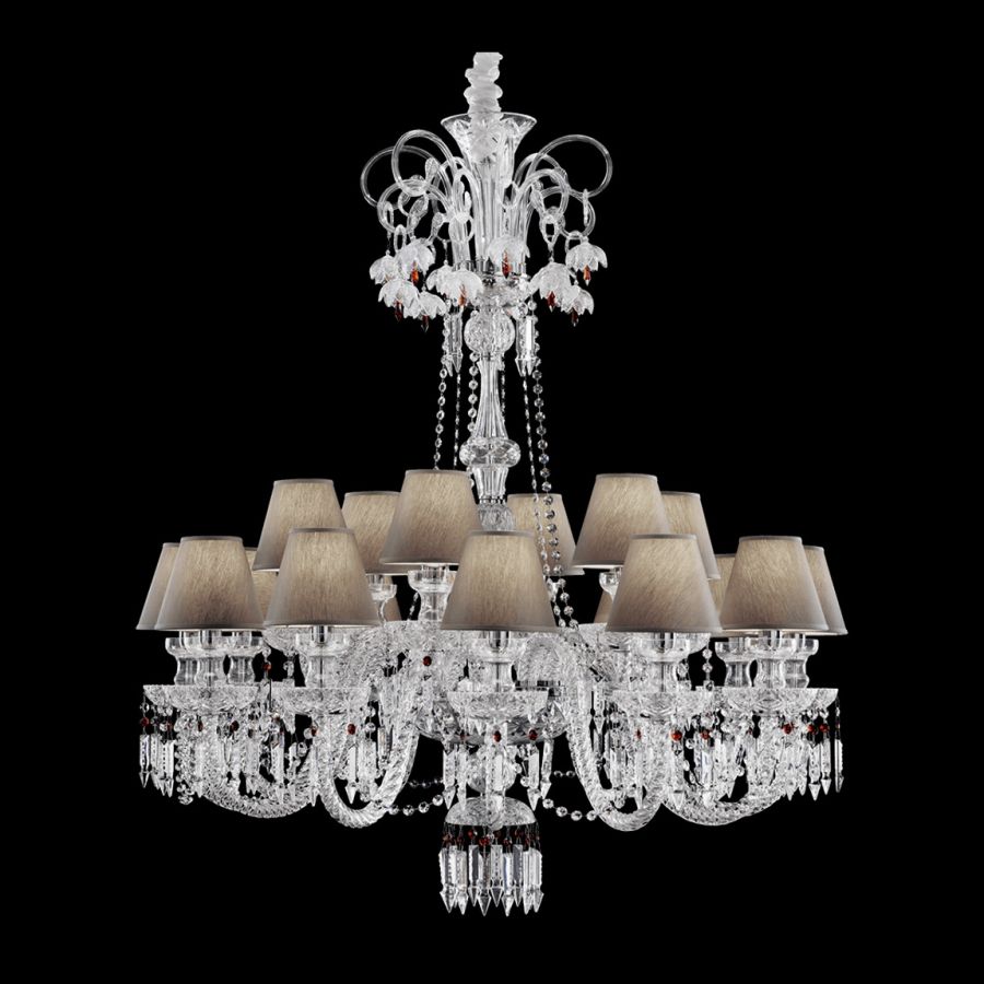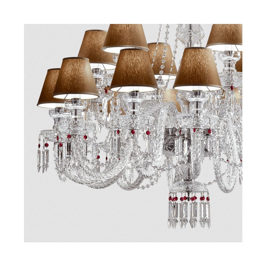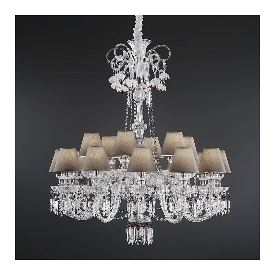 Chandelier in carved crystal and glass, metal with chrome finish, dove fabric shades. Swarovski elements pendants.