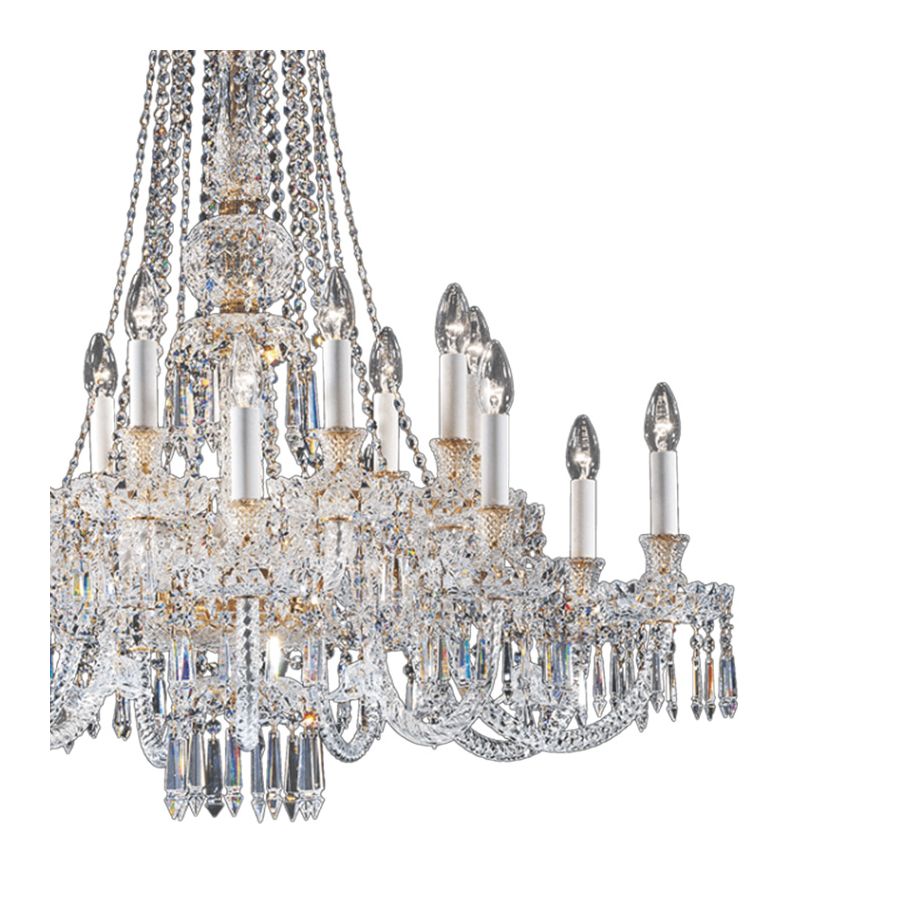 Chandelier in carved crystal, metal with gold finish, Swarovski elements pendants and decorative glass flowers.