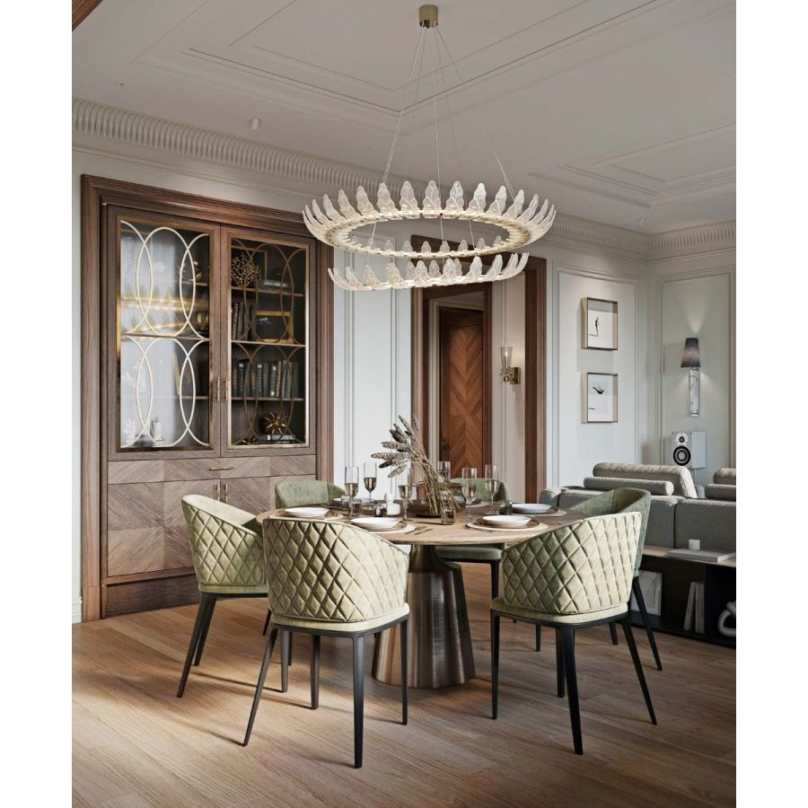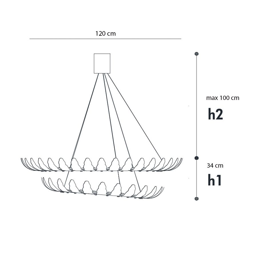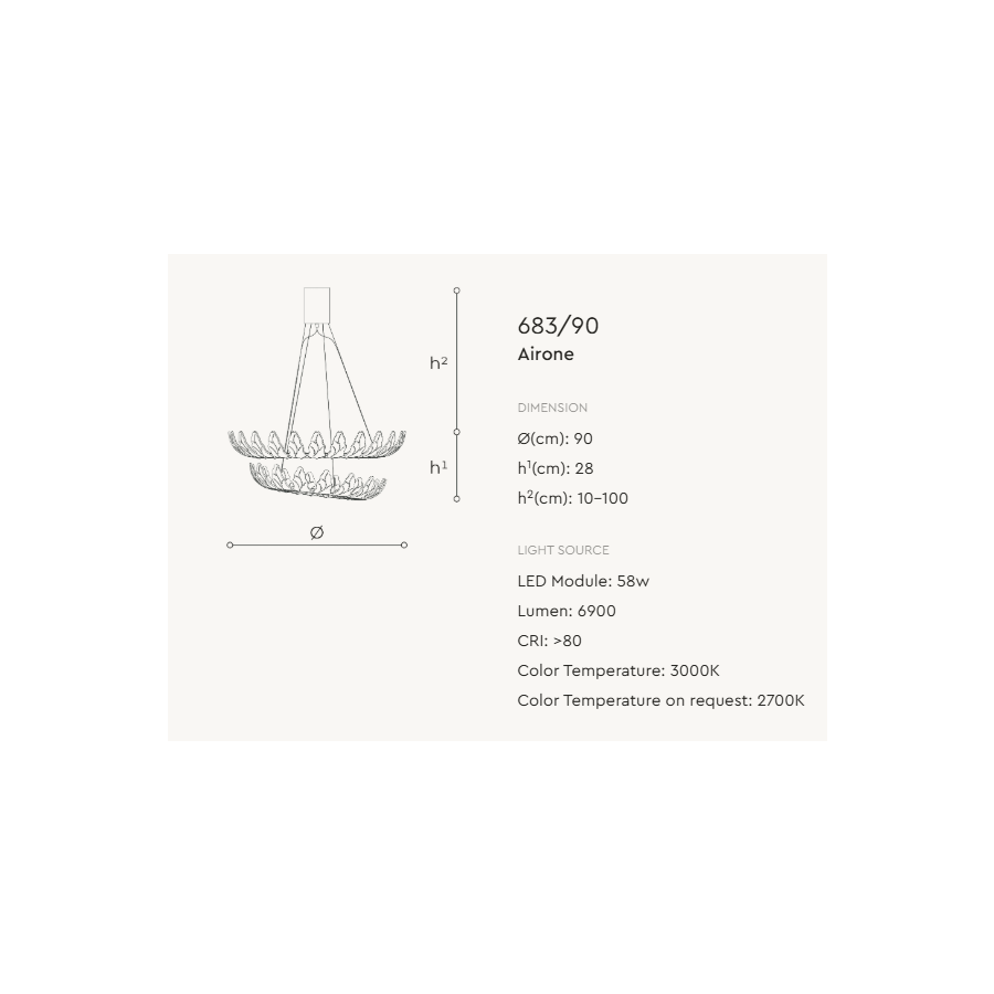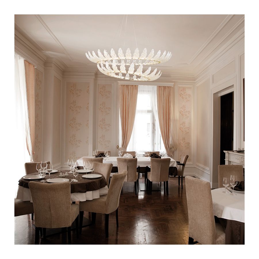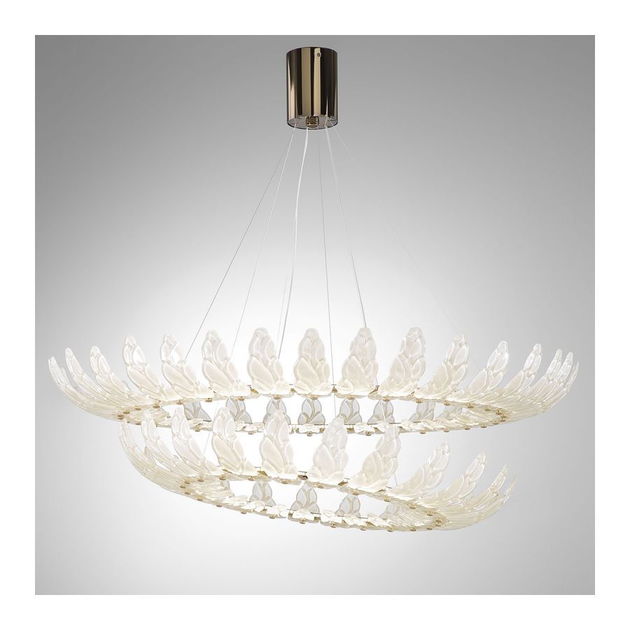 Airone is a chandelier characterized by an essential structure that revisits the glass leaf element in a contemporary way, positioned next to each other on the circles that host the LED source.