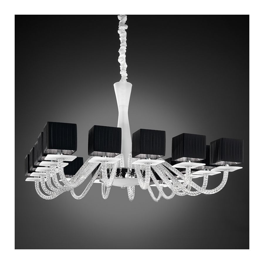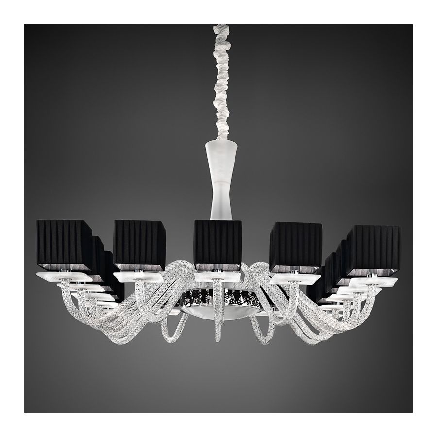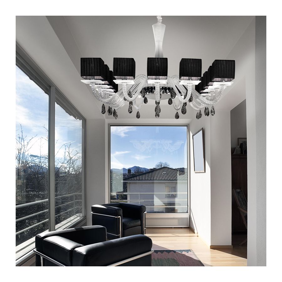 Squared shaped chandelier in satin and transparent glass, black fabric shades and decorative band in black Swarovski Elements, chrome metal finish. Available in different colours.