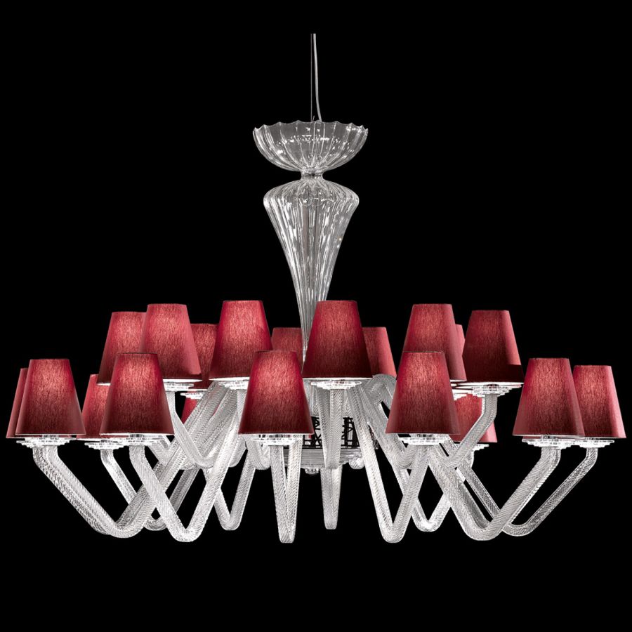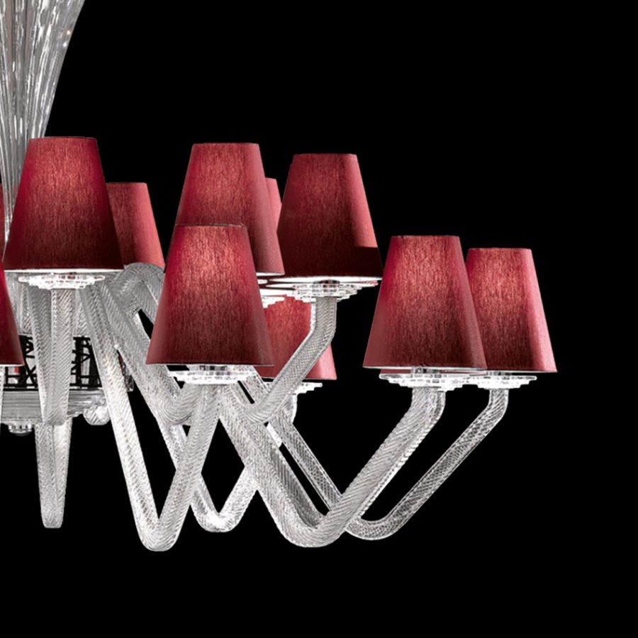 Chandelier in glass with bordeaux fabric shades and decorative band in black Swarovski elements, chrome metal finish.