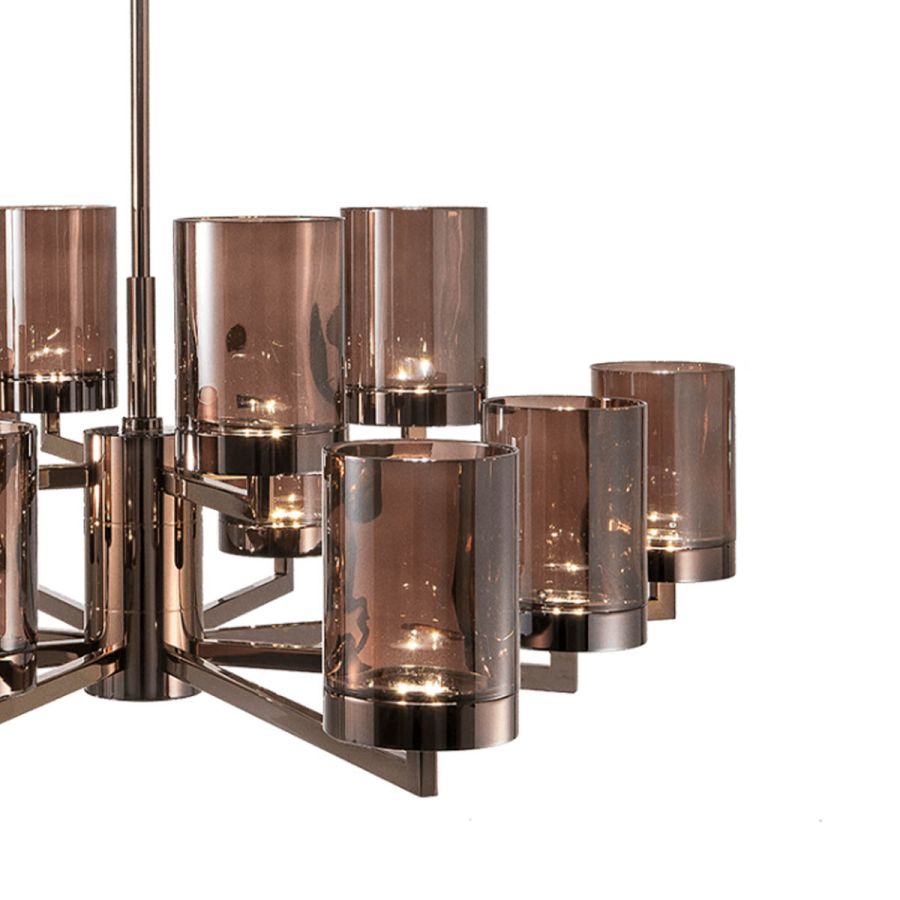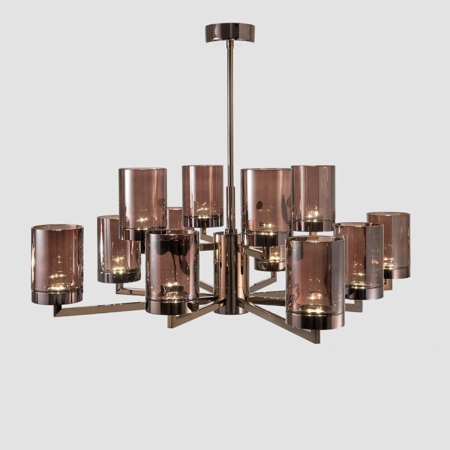 Two tier chandelier Quarzo with gold nickel metal structure and with crystal diffusers in dove colour.