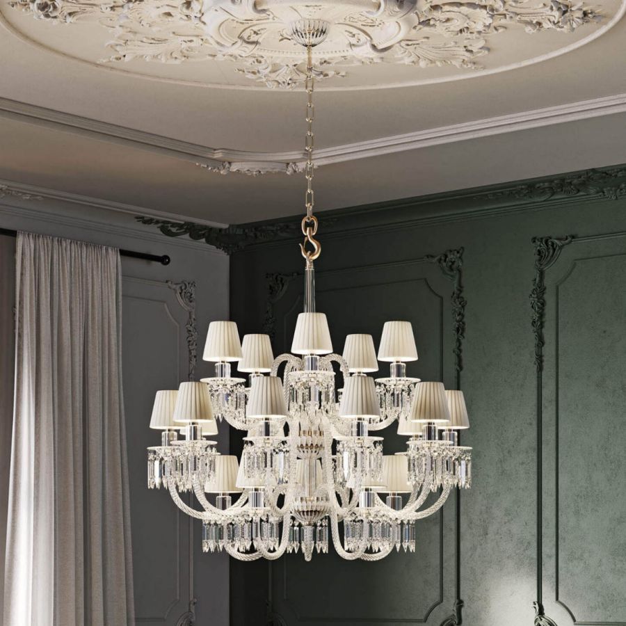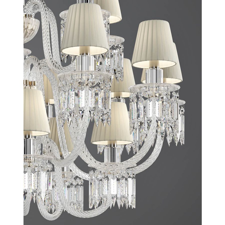 Egle chandelier is a three-level suspension lamp, in crystal and artistic glass. Design Roberta Vitadello. Metal details with chrome finish. Attachment detail with satin gold finish. Lampshades in pleated fabric.
