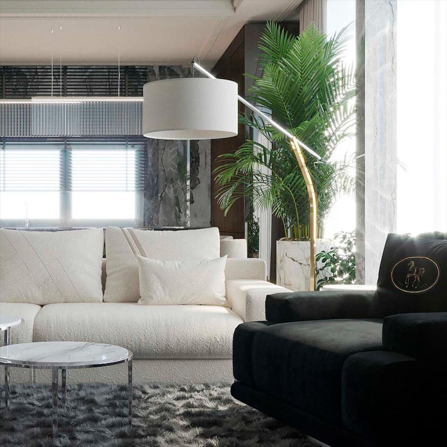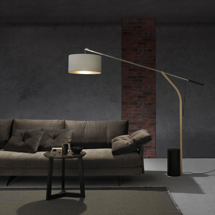 Adjustable floor lamp in metal with matt black, chrome and brushed gold finish. Ivory fabric diffuser with gold colour Inside.