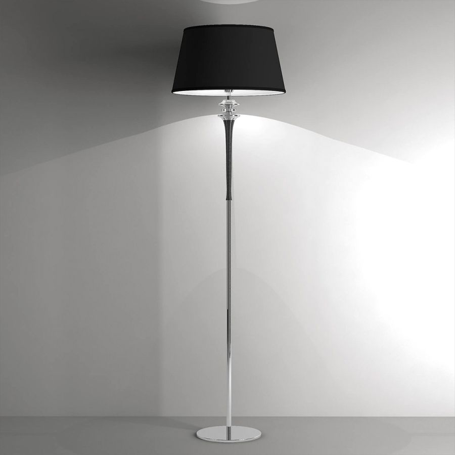 Floor lamp in metal with black and chrome finish, glass detail and black fabric shade. Available in different colours. Opera Classic Collection.