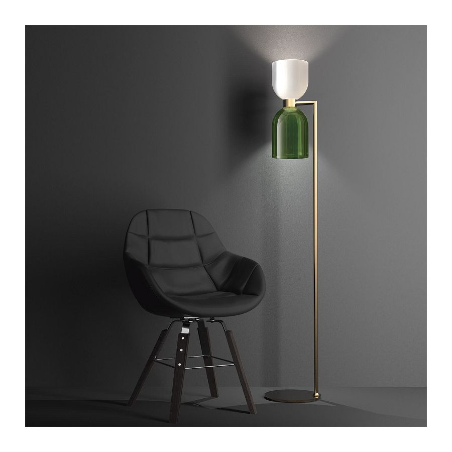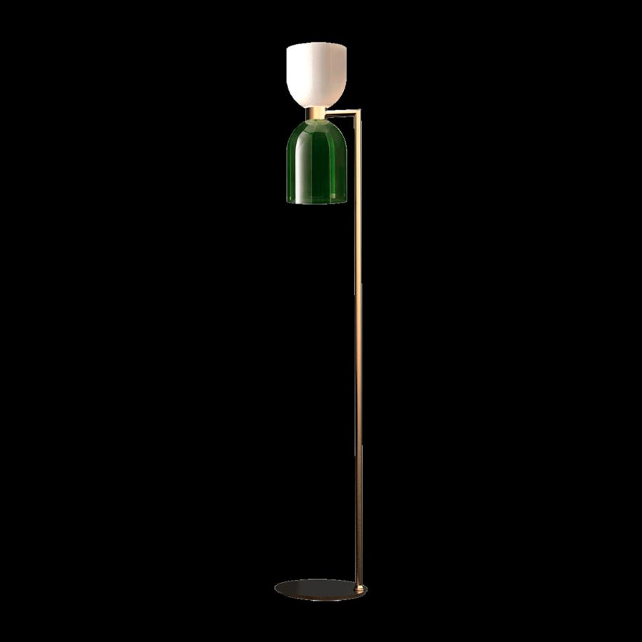 Floor lamp in metal with brushed gold finish with opal white and green glass diffusers.