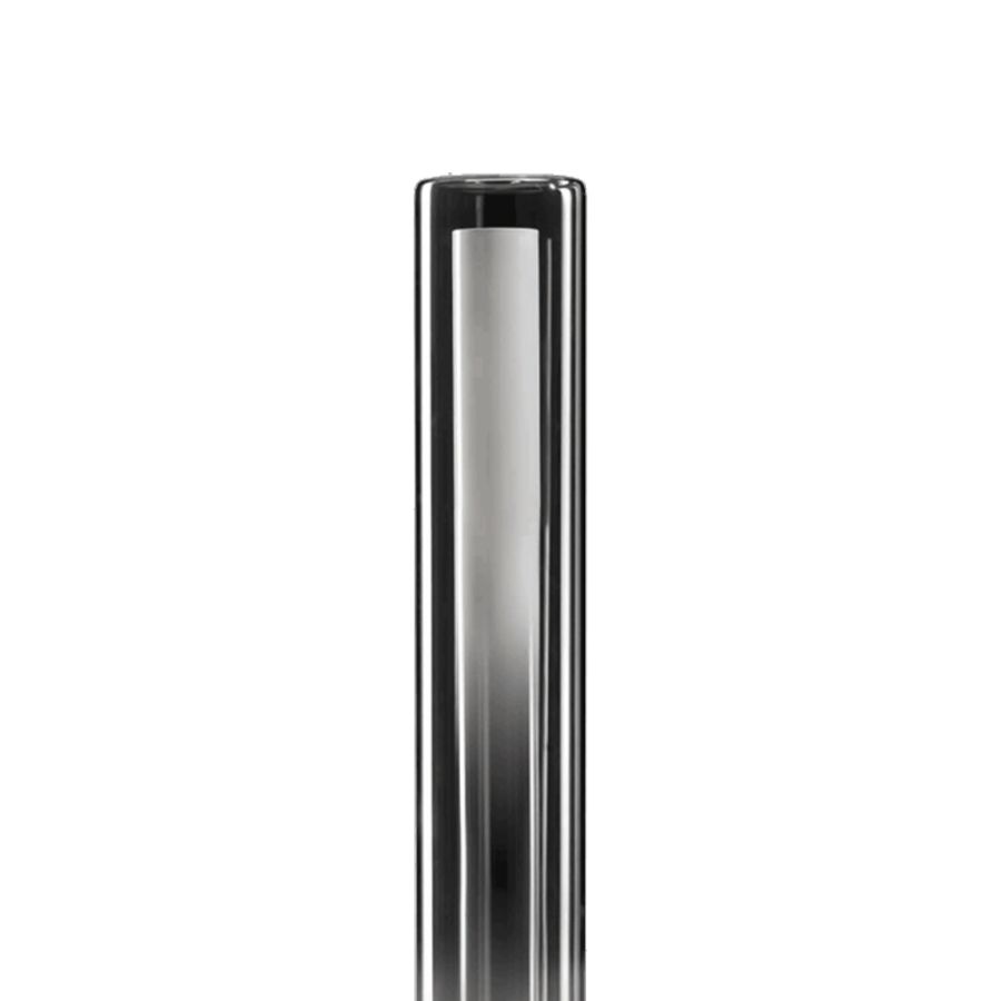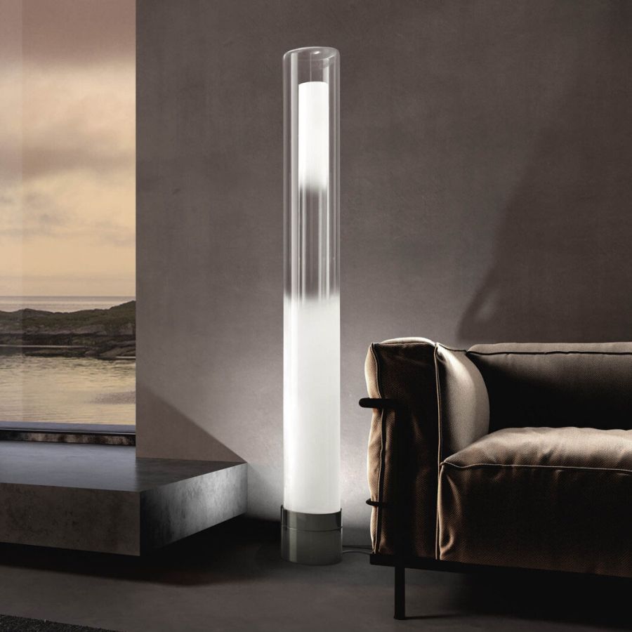 Floor lamp composed of two clear glass cylinders, one included in the other, with white smoked effect for convergent fades. Metal base with iron grey finish.