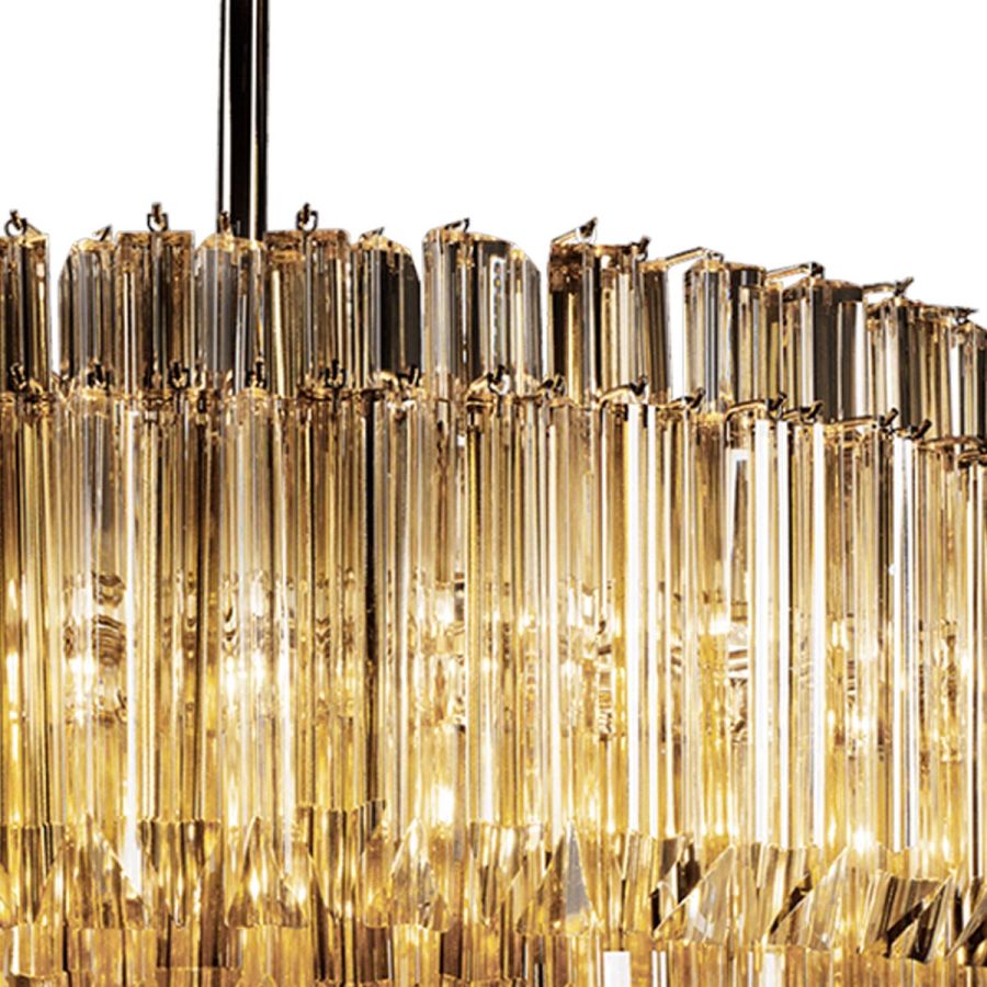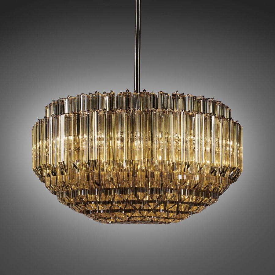 Pendant lamp made of amber glass trihedrons, metal with gold finish. Available in two colours. Opera Classic Collection.