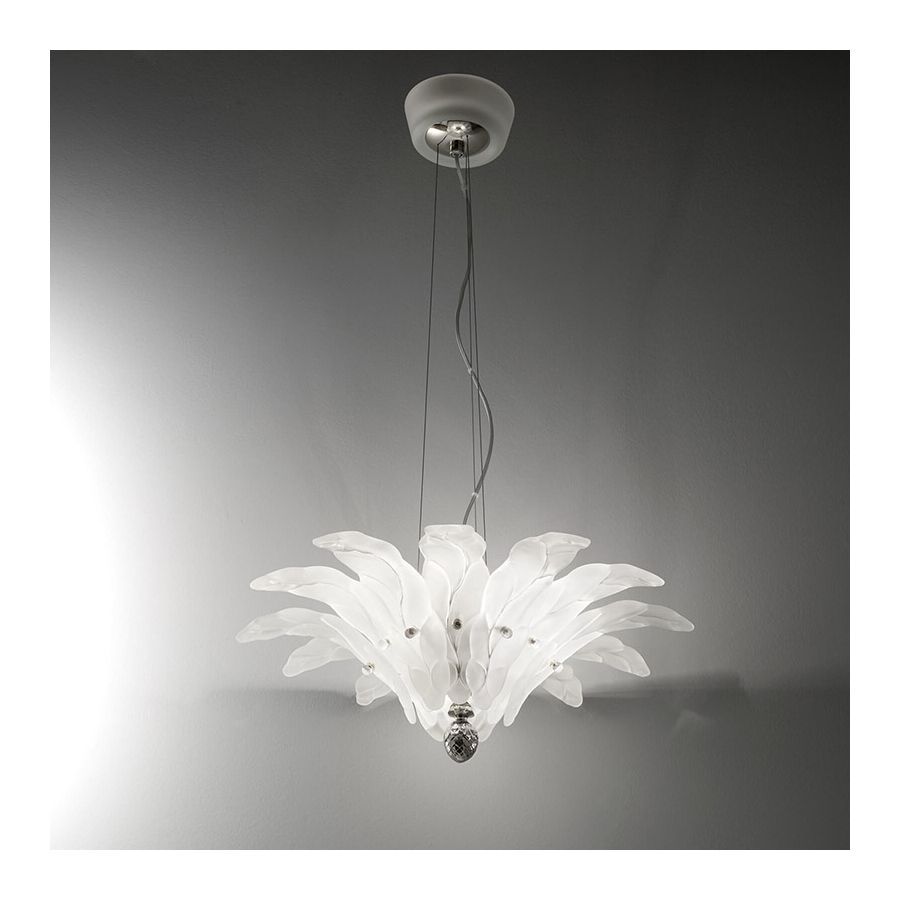 Pendant lamp with satin glass leaves and metal with nickel or gold finish.