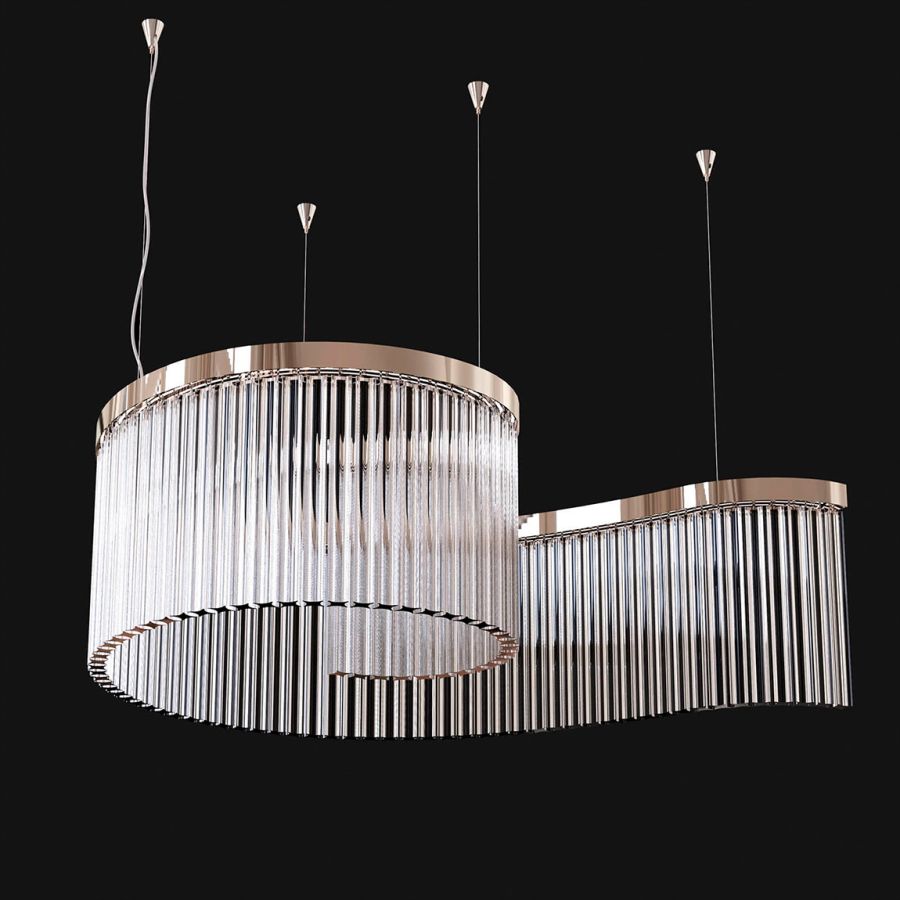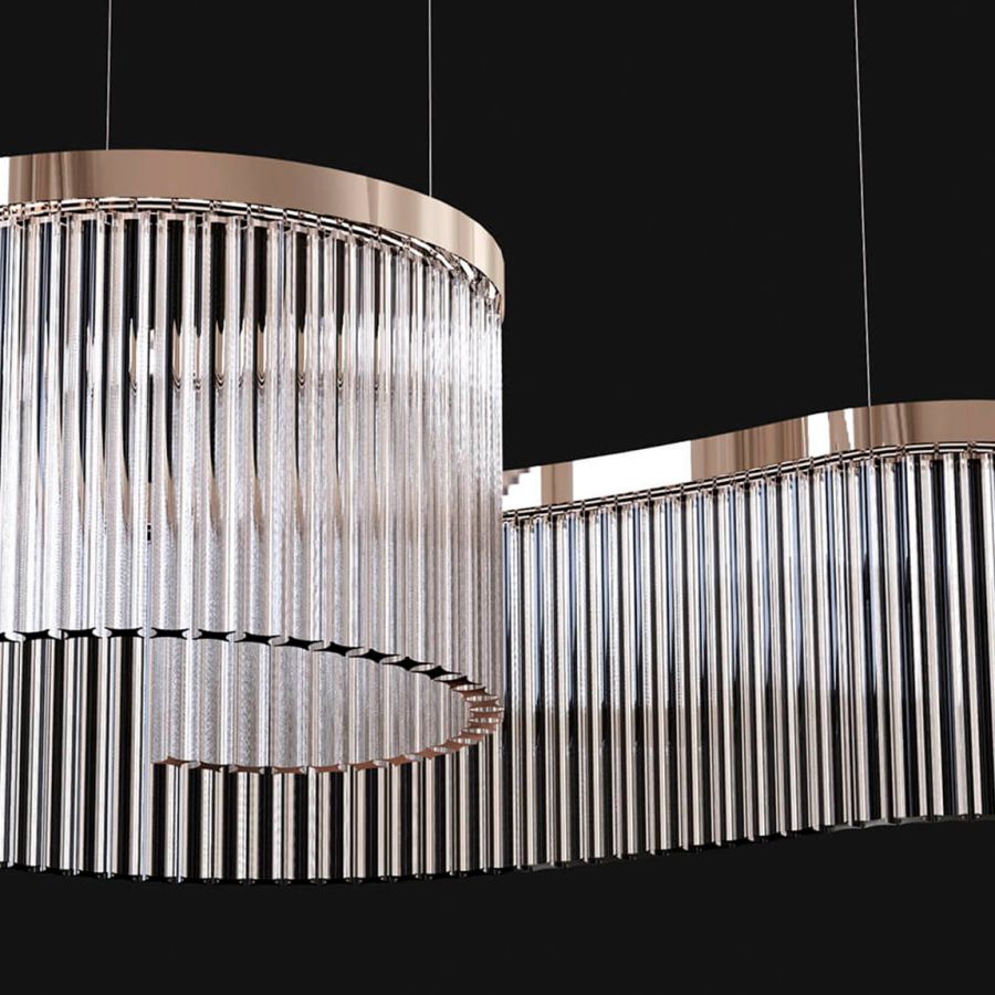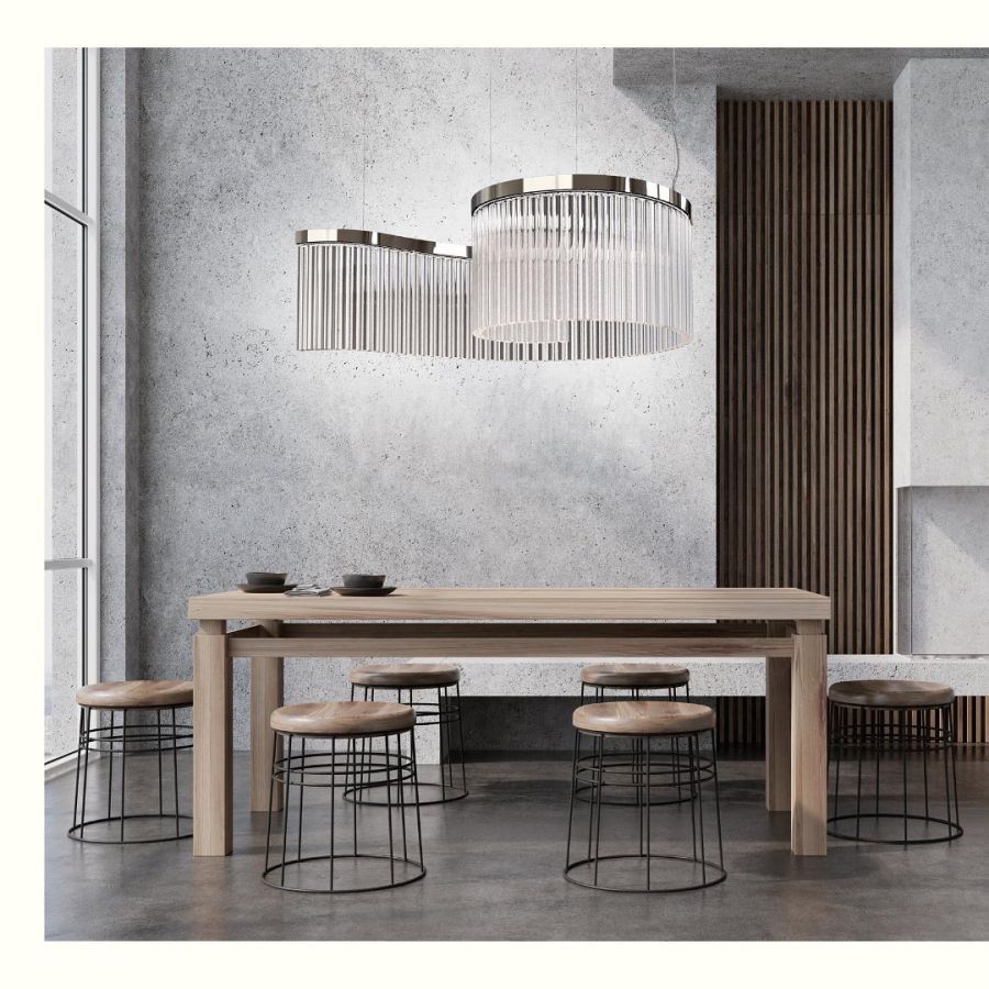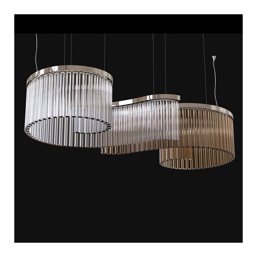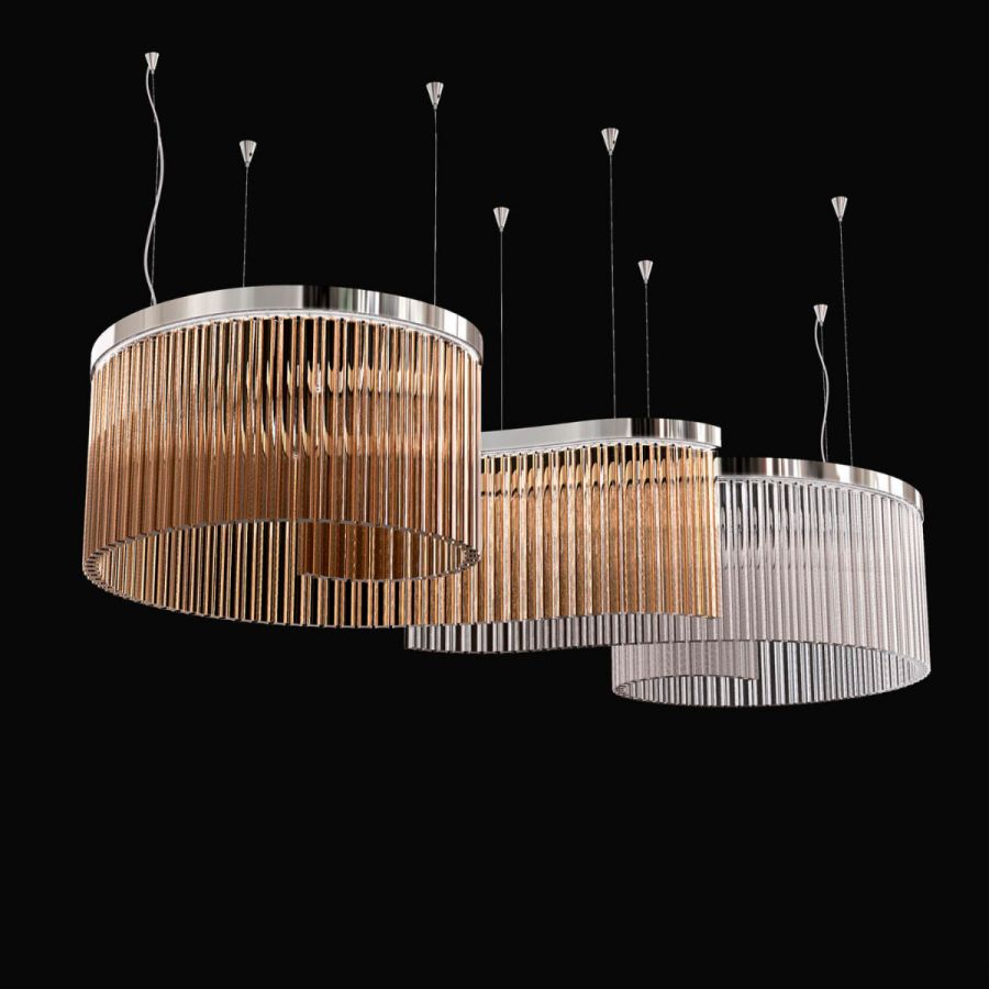 Carmen is a collection that gives a creative and contemporary twist to the classic chandelier. Simple in its structure Carmen is a jewel lamp composed of a minimal metal frame in chrome finish to which have been combined rows of quadrihedra in transparent Murano glass or teak that filter the light coming from the perimeter source with an effect suggestive reminiscent of a waterfall.