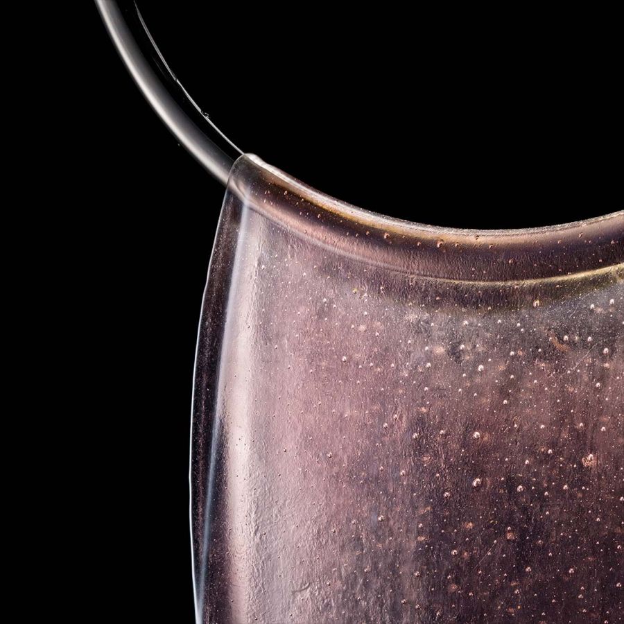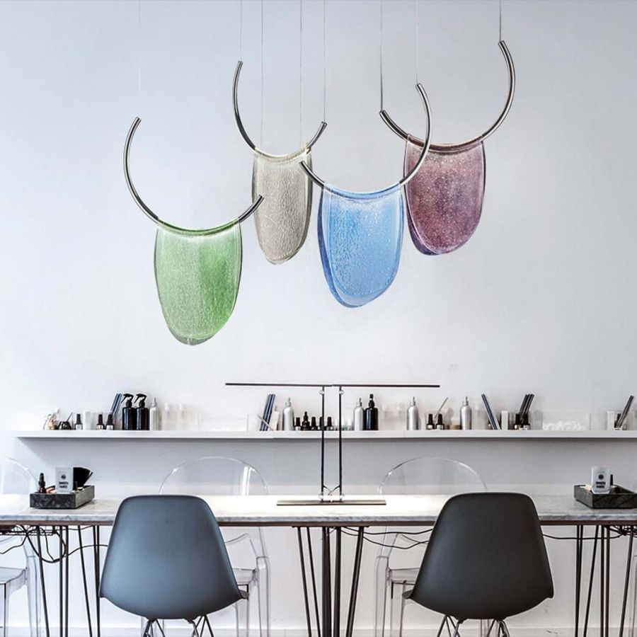Pendant lamp with thermoformed glass and metal structure with iron grey finish. Available in different colours: amethyst, blue, grey and green.