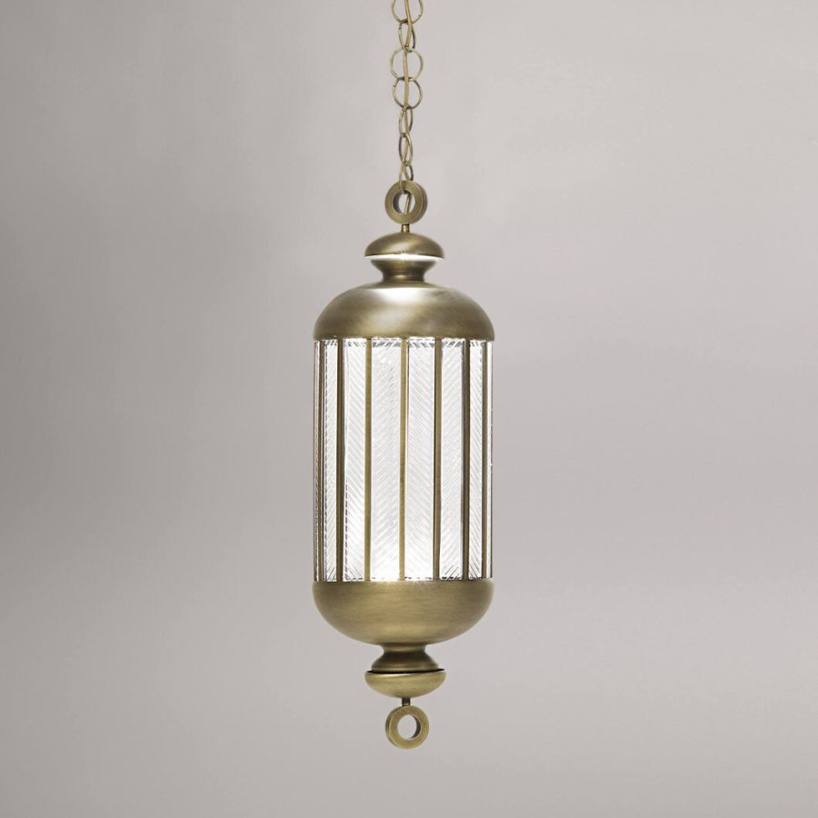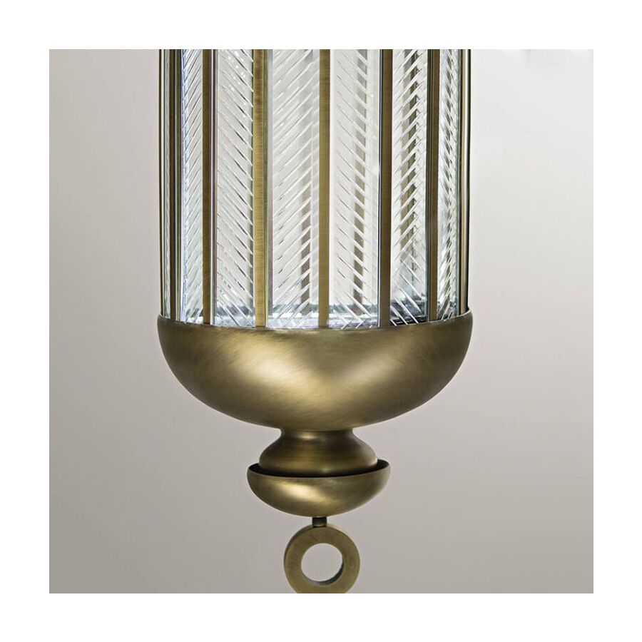 Pendant lamp in metal with antique gold finish and carved glass diffuser.