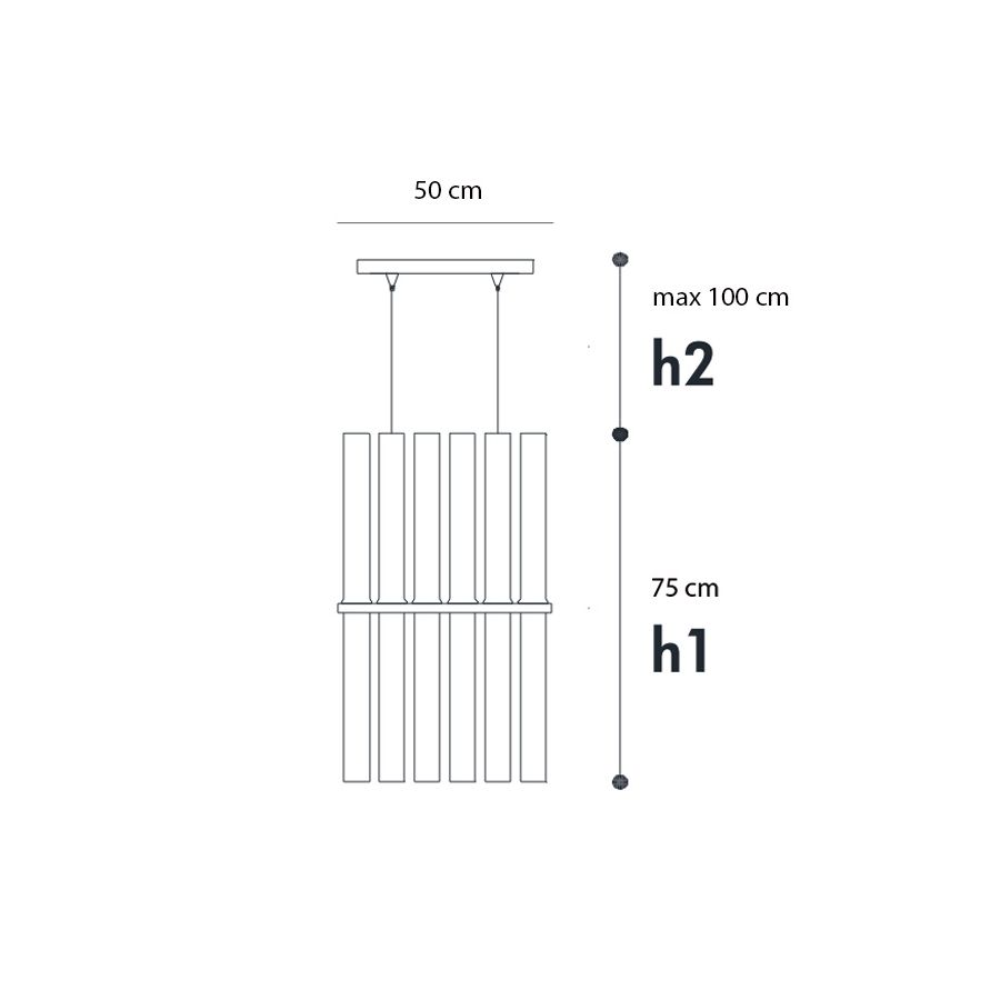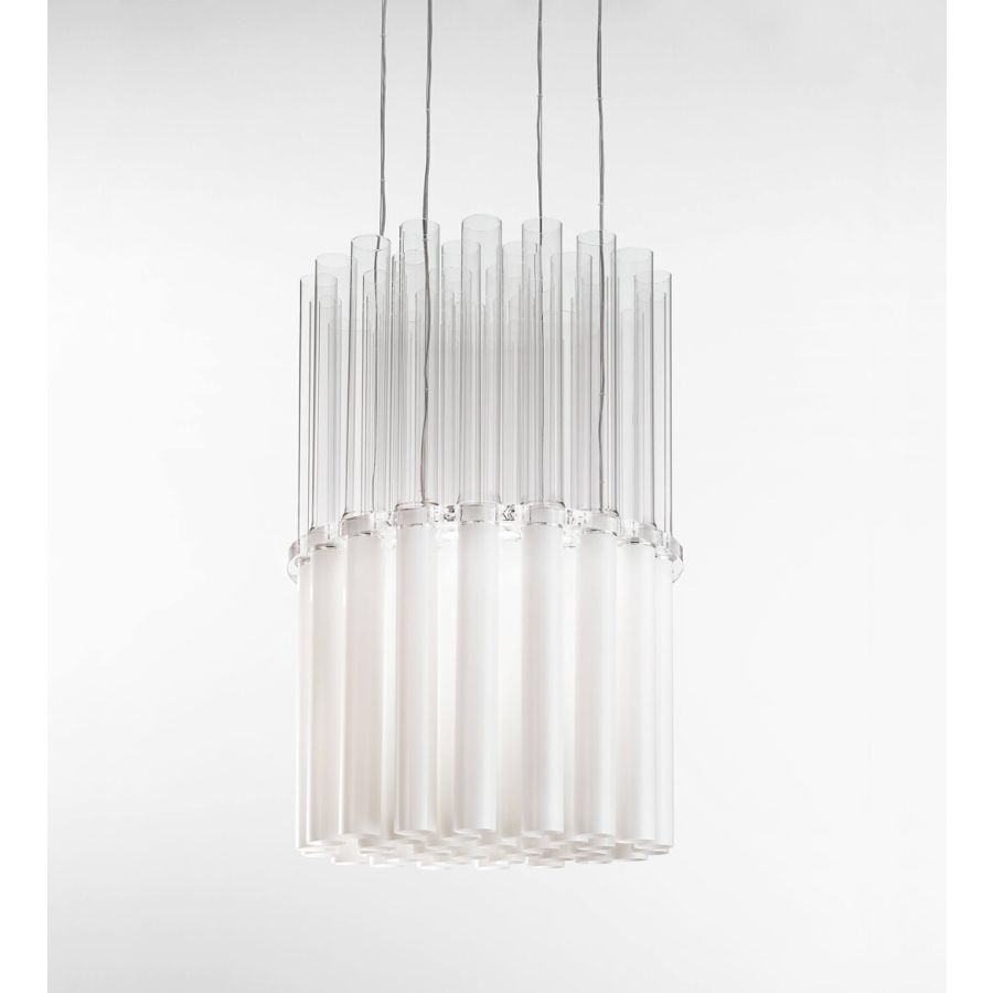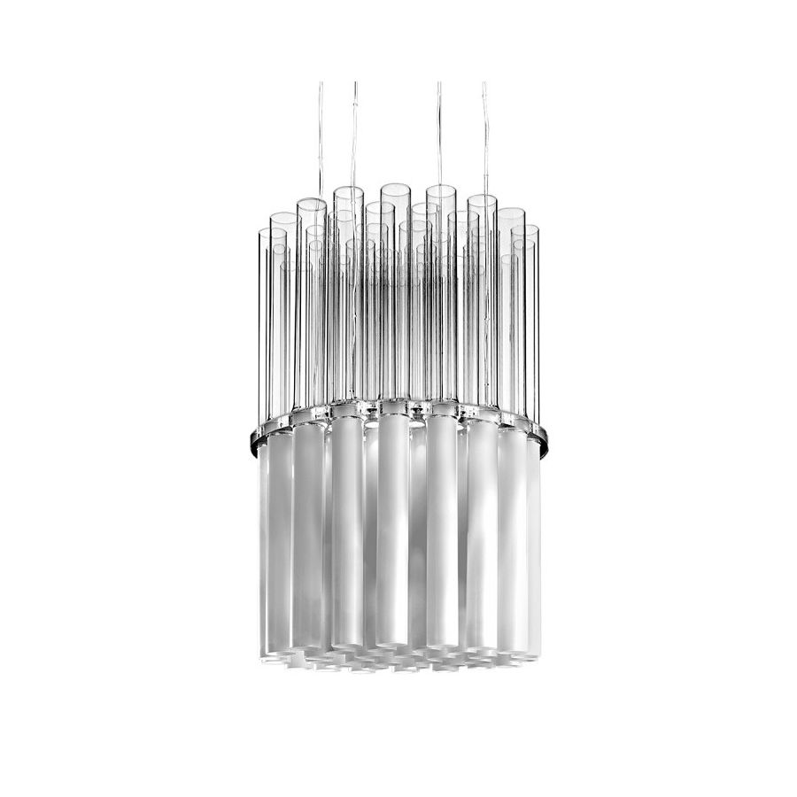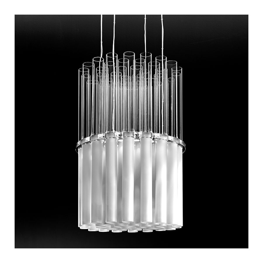 Pendant lamp composed by glass tubes in clear and satin finish. Metal details in chrome..
