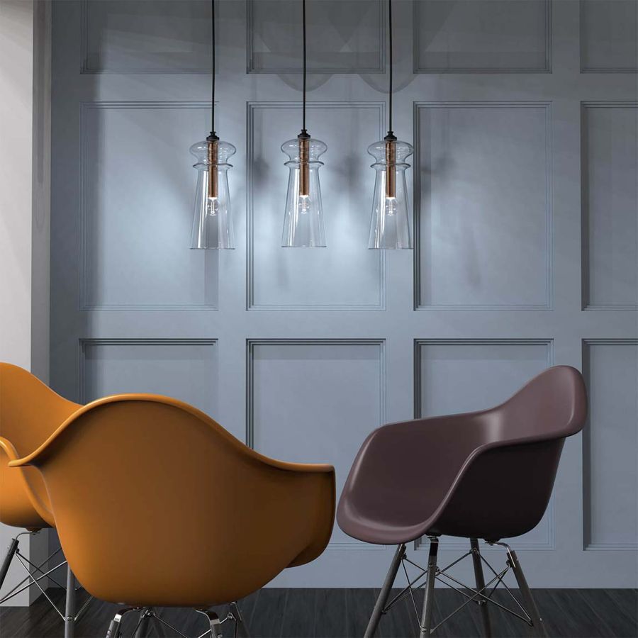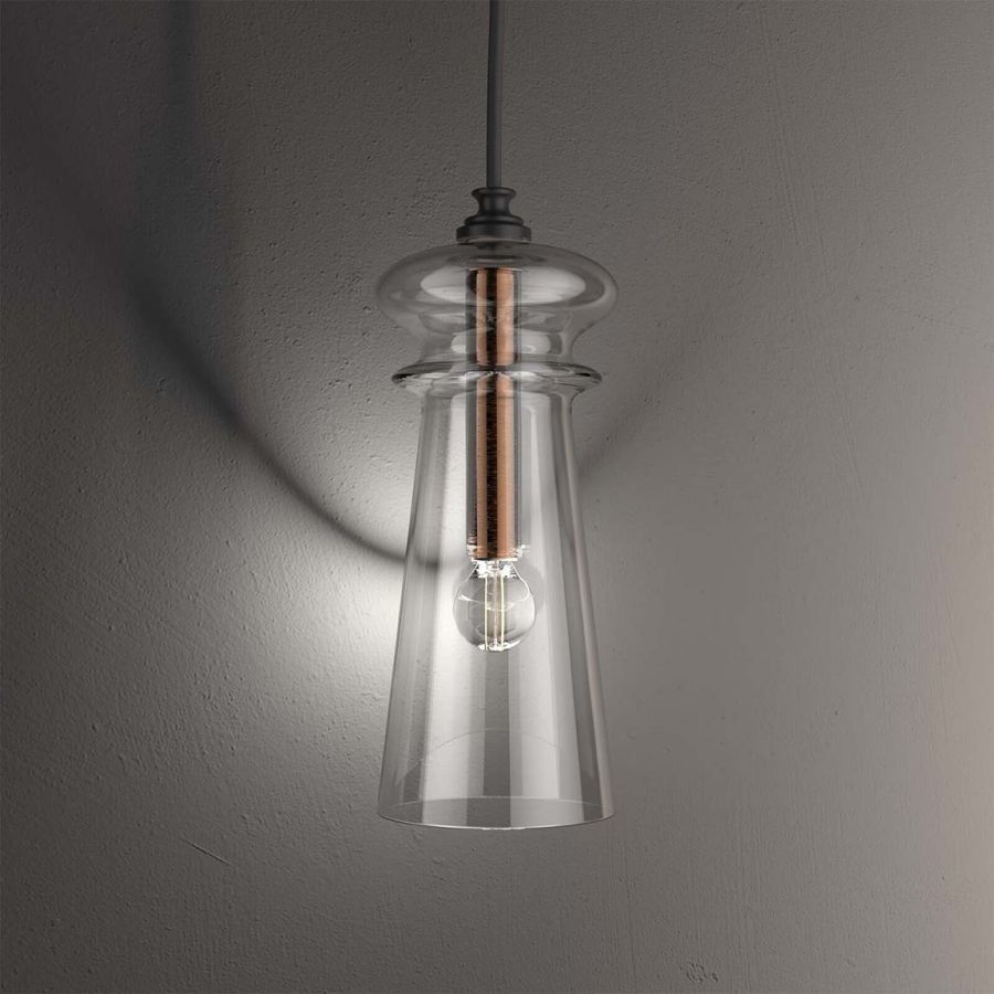 Pendant lamp with clear glass and metal structure. Available in three finishes.