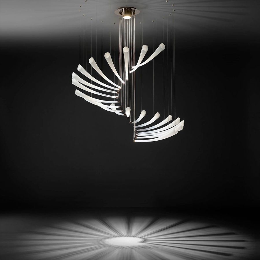 PULSA SPIRA is the new suspension designed by Danilo De Rossi, inspired by the seeds from the maple tree. A light sculpture meant for being the main character of elegant and refined spaces, providing a unique game of shadows and light effects all arround it.