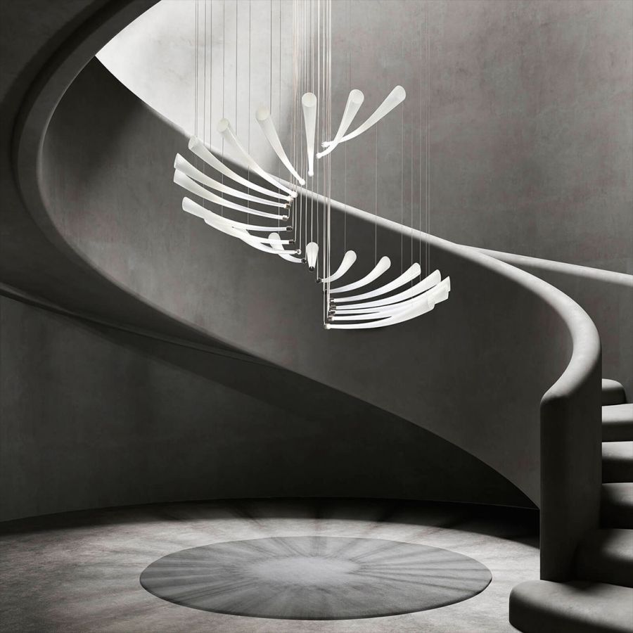 Italamp presents Pulsa Spira designed by Danilo De Rossi, an important suspension that represents in the form of light the twirling of a maple seed through the air, articulated thanks to a composition of blown glass elements arranged in a spiral. The composition can be customized to develop the helix shape in height. Pulsa spira combines an extremely contemporary design with the historical heritage of glass processing and is the latest addition to the existing Pulsa collection.