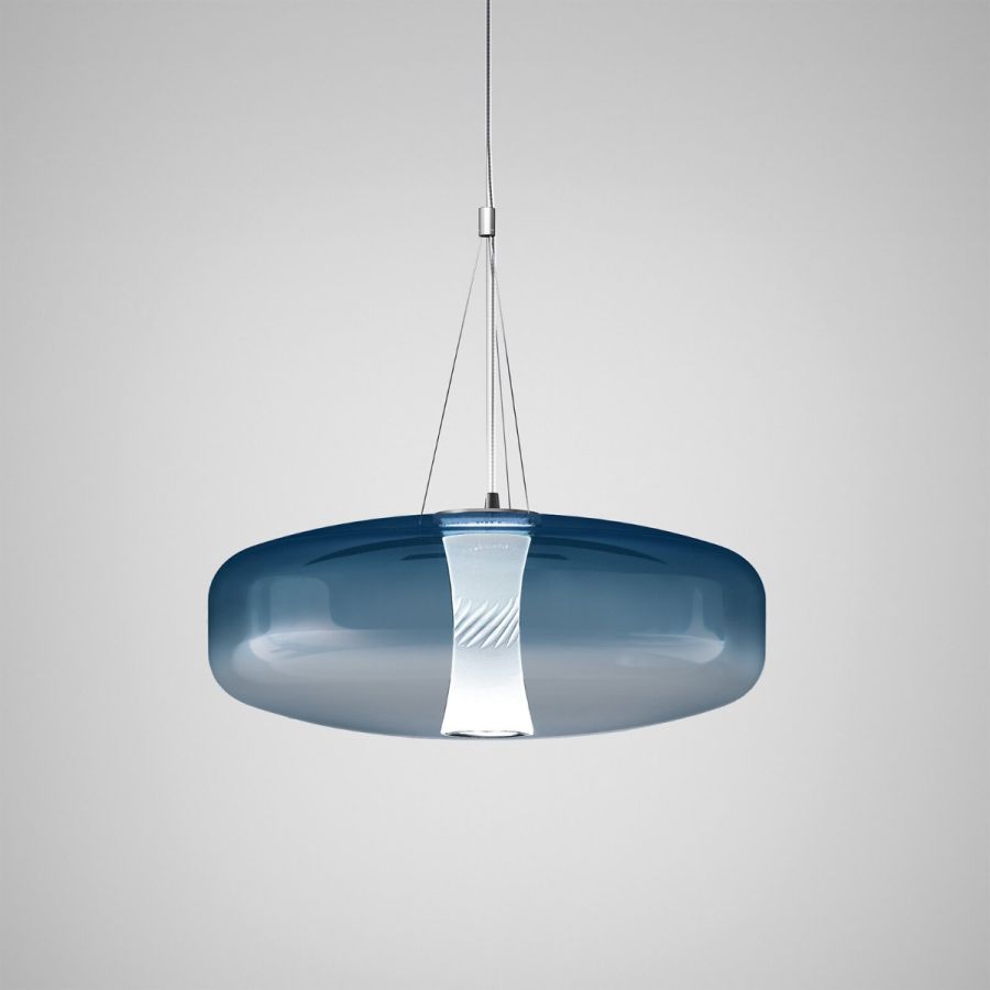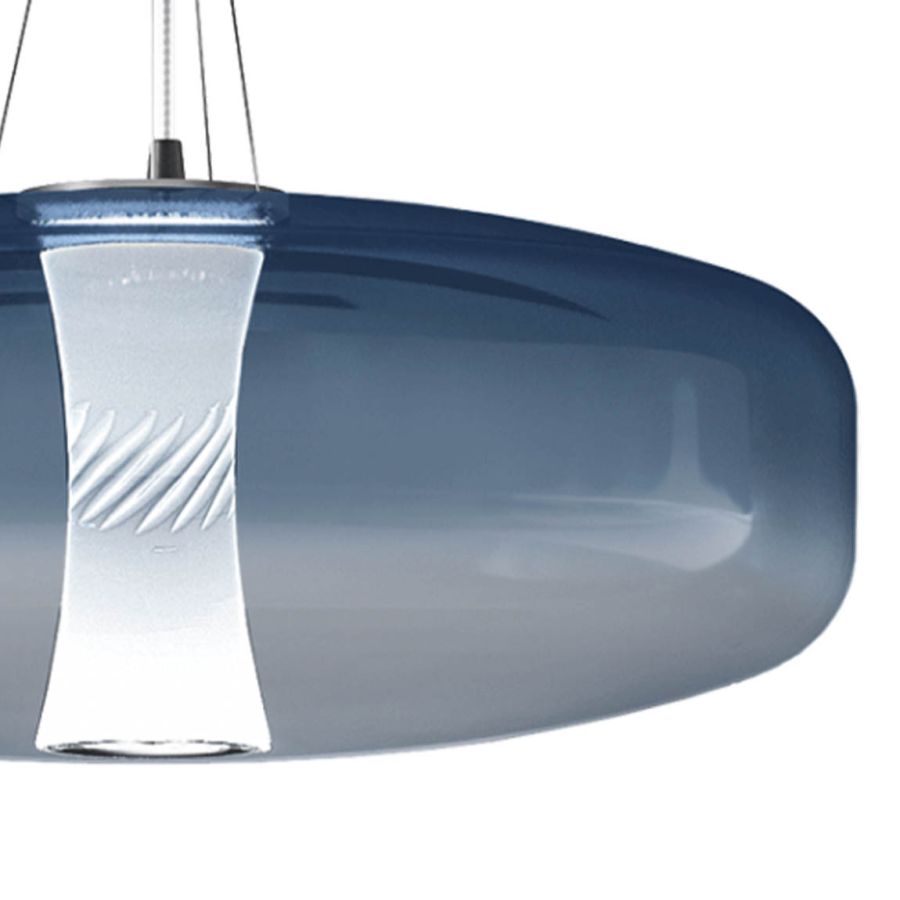 Pendant lamp in blown glass with shaded blue or shaded gold finish. Internal diffuser in hand-carved white blown glass diffuser. Metal structure with iron grey finish.