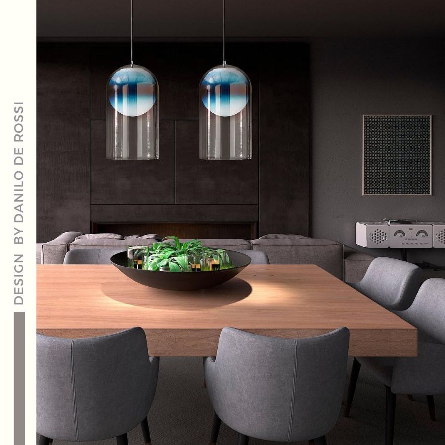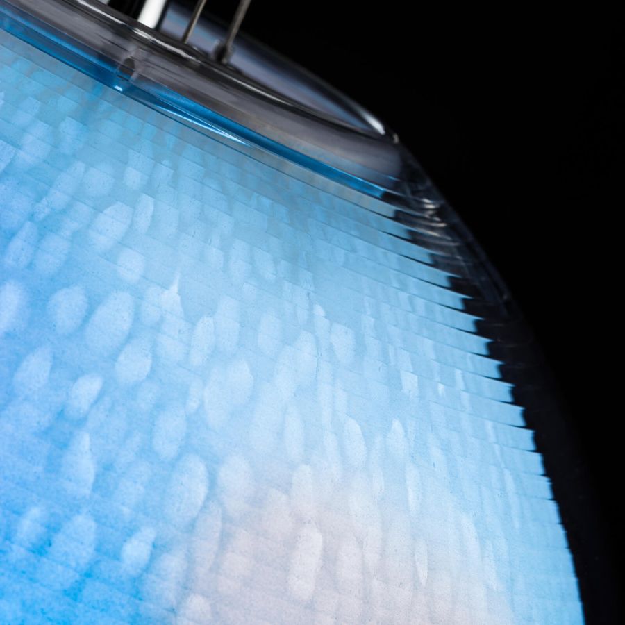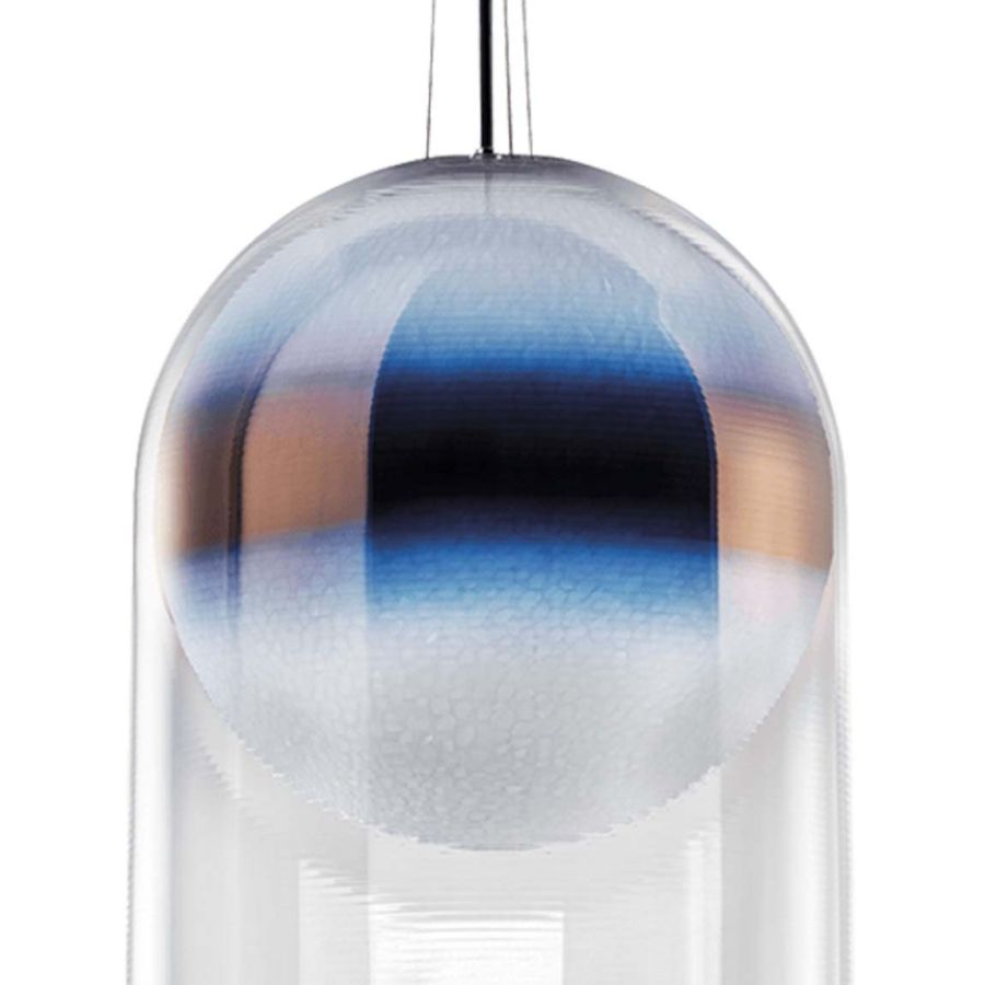 Marta lamp decorated with a central copper-coloured band (that becomes blue with the light), creating a kind of warm ring around the sphere between two “icy” caps: a clear and powerful image, resembling the planet Mars.
