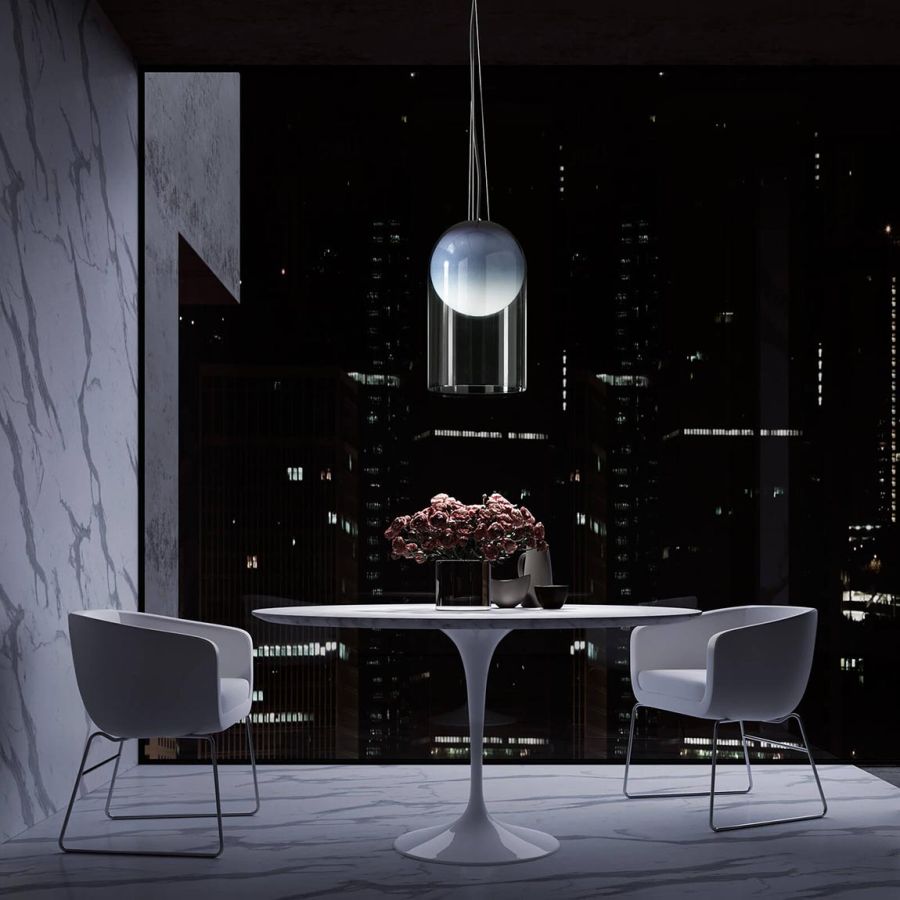 Muna Lamp structure: a white blown glass sphere and a borosilicate glass cover that encases it. The sphere has an irregular poriferous surface, featuring a series of micro-craters that evoke the shape of the moon. This effect is further enhanced in the Muna version, where the cover has an upper cap painted in blue, which appears to fade downwards, giving the lamp its magnetic and lunar appeal.