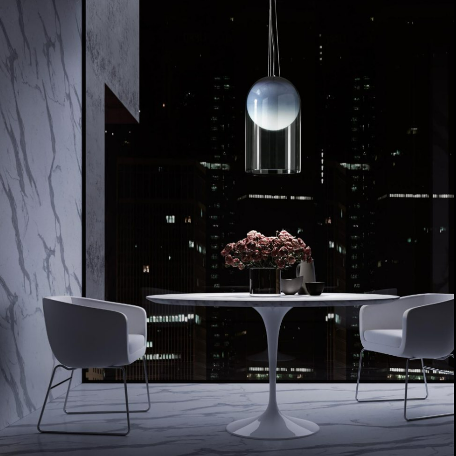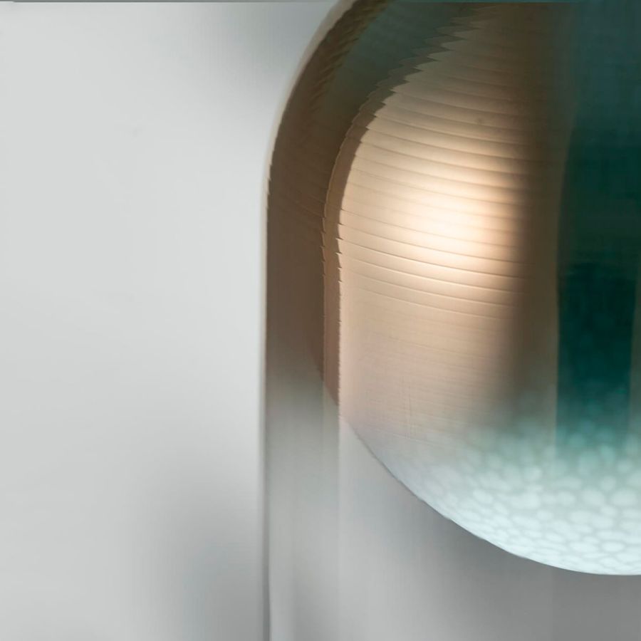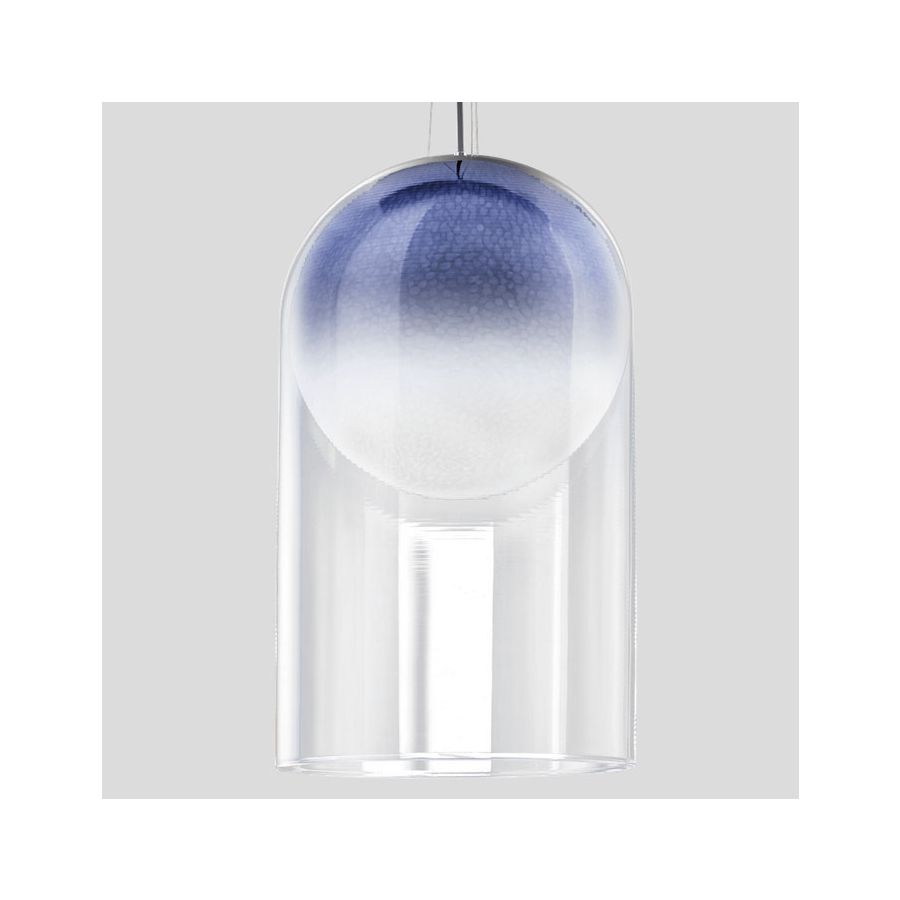 Muna Lamp structure: a white blown glass sphere and a borosilicate glass cover that encases it. The sphere has an irregular poriferous surface, featuring a series of micro-craters that evoke the shape of the moon. This effect is further enhanced in the Muna version, where the cover has an upper cap painted in blue, which appears to fade downwards, giving the lamp its magnetic and lunar appeal.