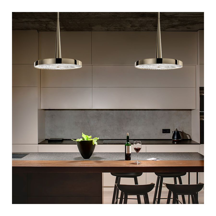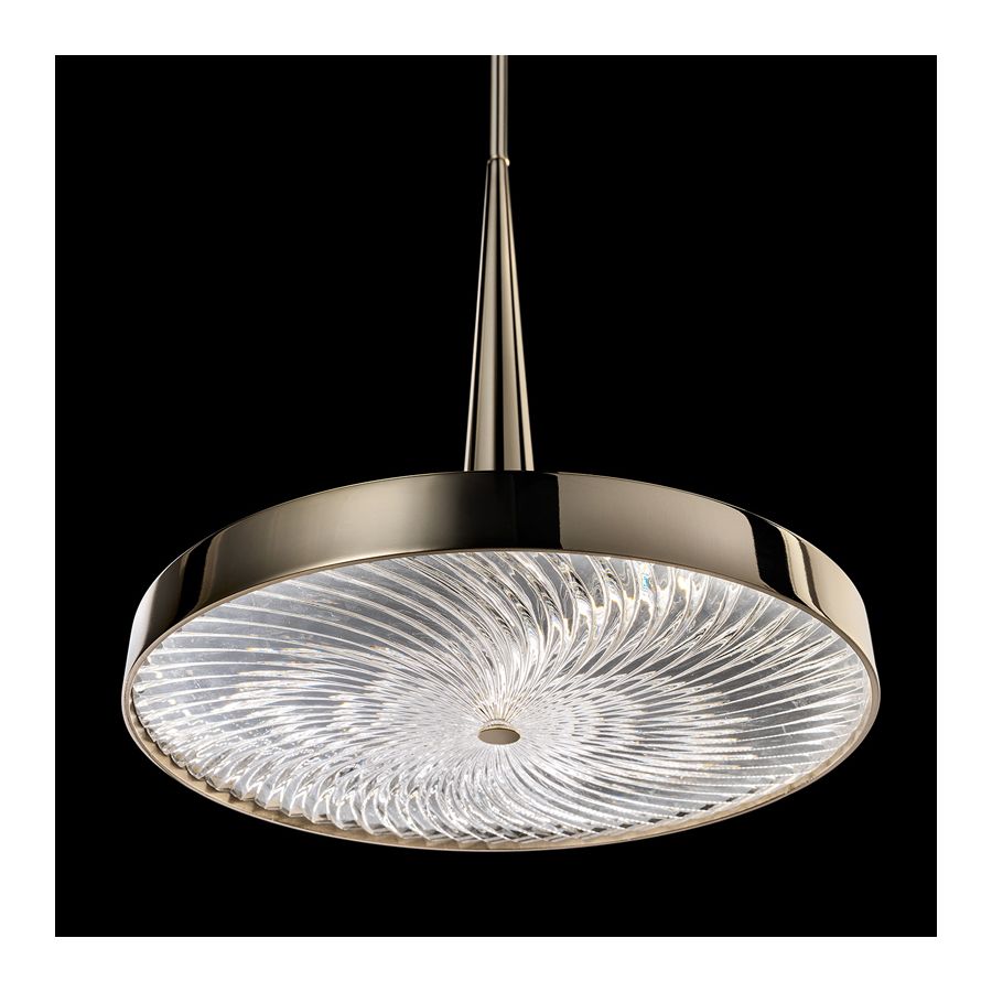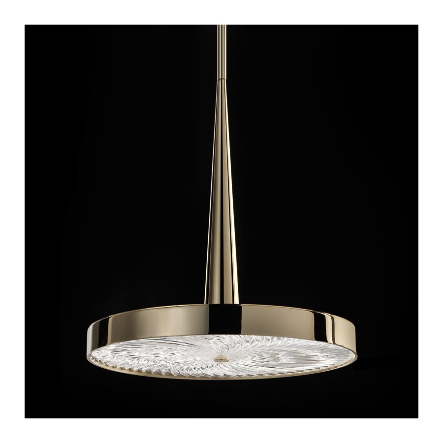 Pendant lamp in metal with light gold finish and carved crystal diffuser.