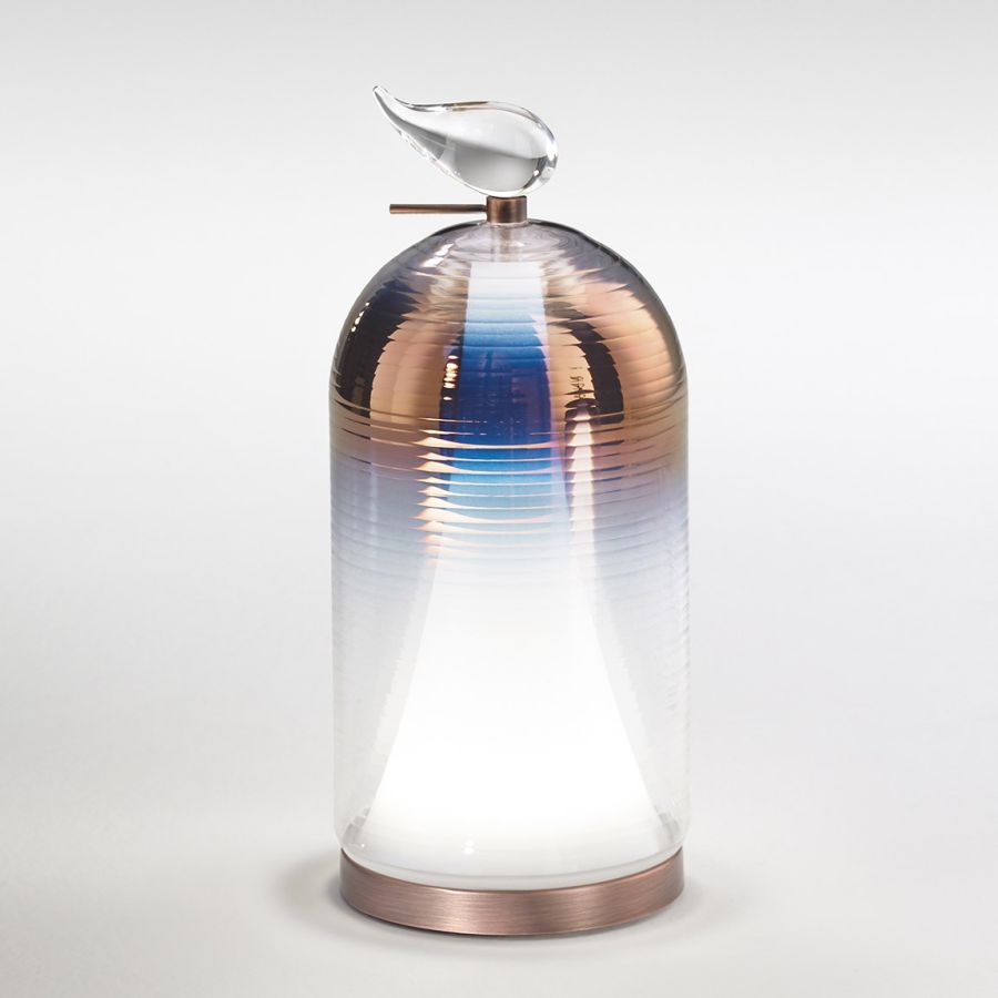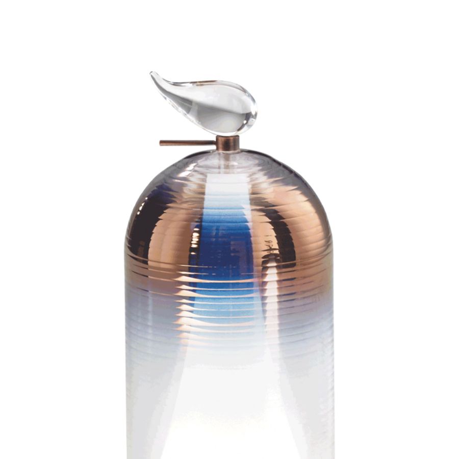 Shaped blown glass diffuser with blue shaded, copper "Lustro" finish and crystal curl. White glass internal diffuser. Metal structure with brushed copper finish. Crystal detail.