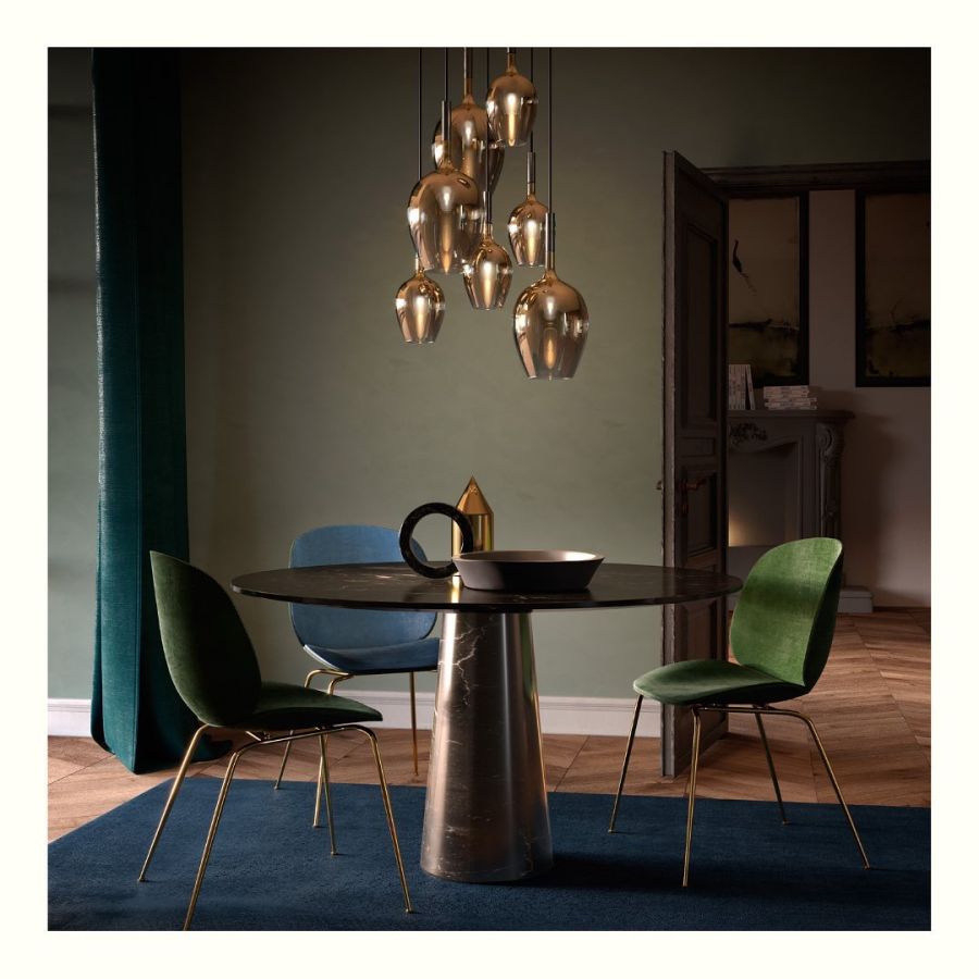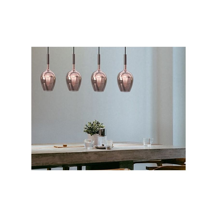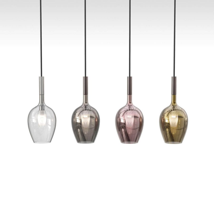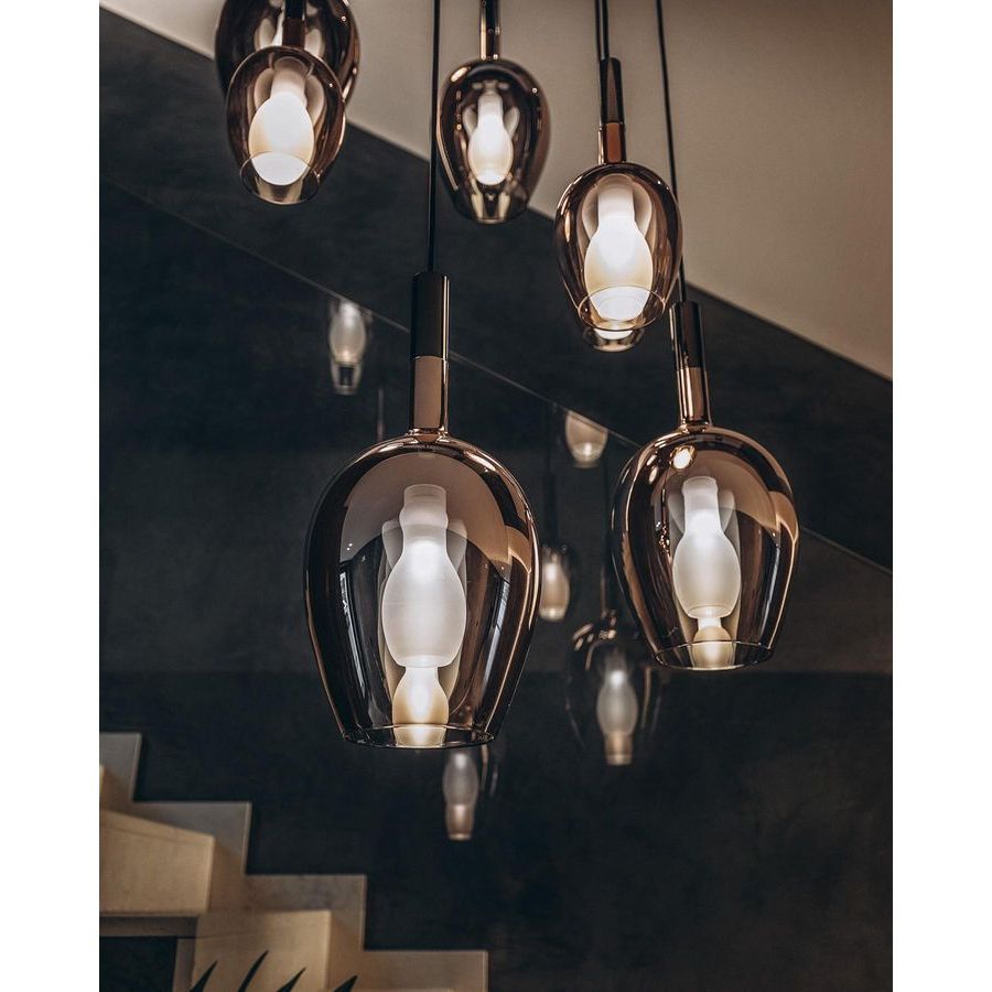 The iconic Rosè collection is inspired by the classic silhouette of the wine glass, reinterpreted in an unusual way in the form of a lamp. The blown glass diffuser has a metallic effect and its finishes recall the shades of rosé wine of which the project is a tribute.