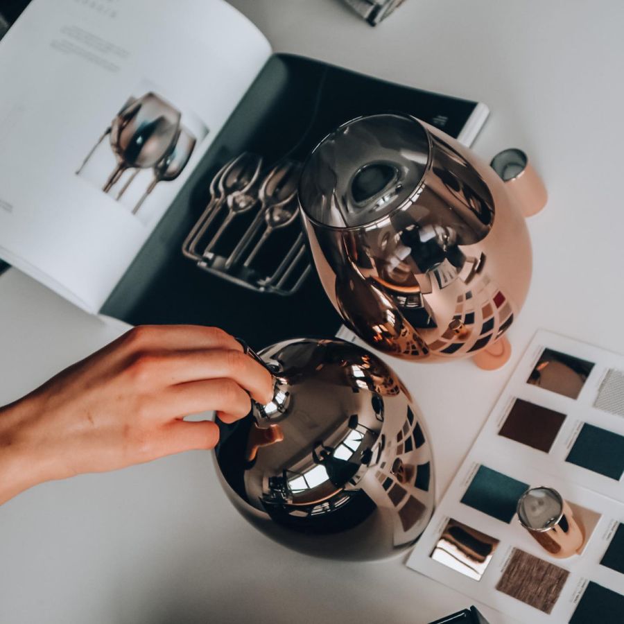 To create Rosé lamp, the designer Danilo De Rossi aims to interpret the light in the environment with an unusual and ironic look, playing with the sinuous shape and its sparkling finishes, inspired by the classic outline of the wine chalice, reinterpreted in an unusual way in the form of a lamp with original metallic shades.