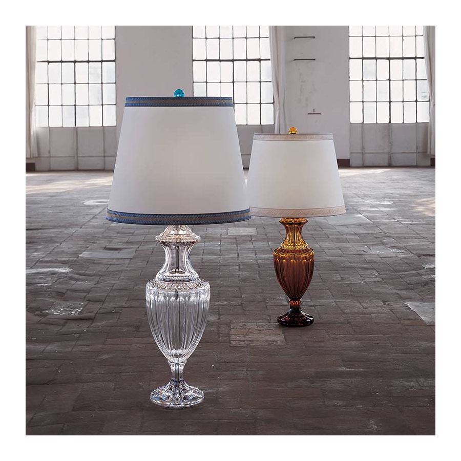 Table lamp in clear carved crystal and ivory fabric shade. Metal details with chrome finish.