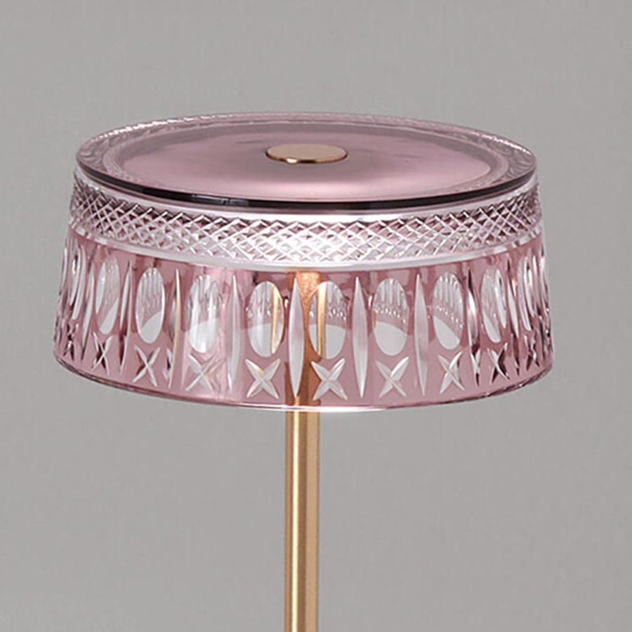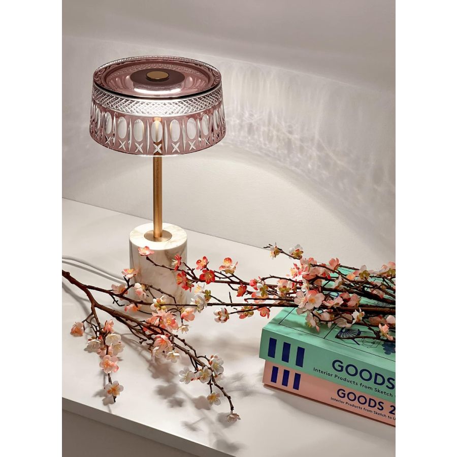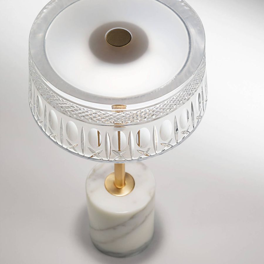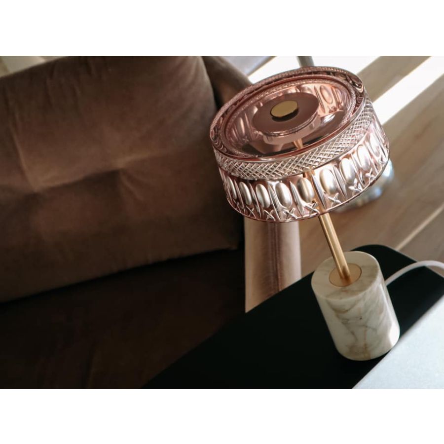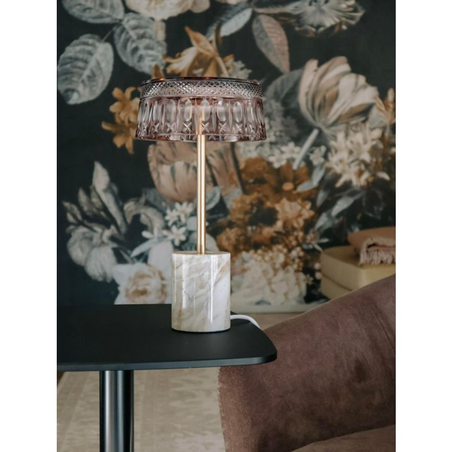 Table lamp with carved crystal diffuser in etched or aubergine colours. Calacatta gold marble base and brushed light gold structure.