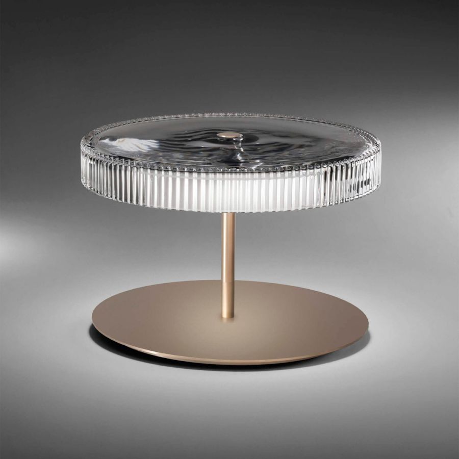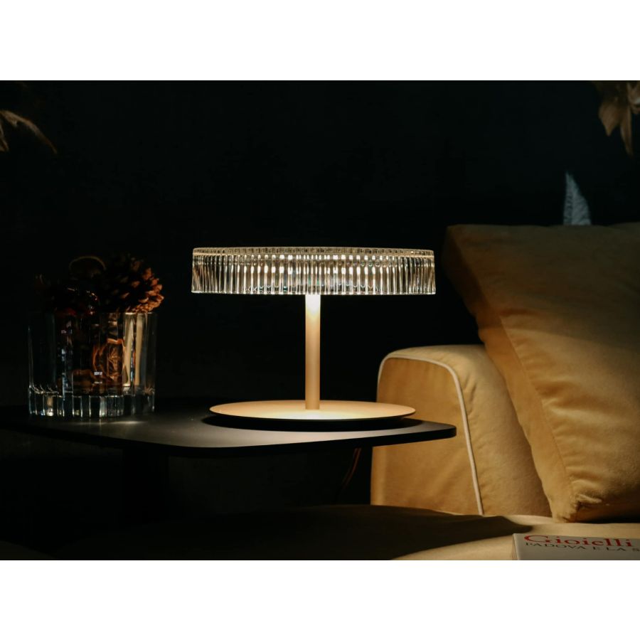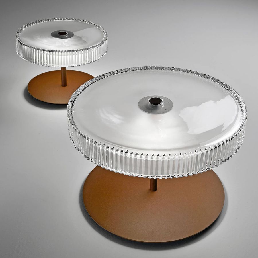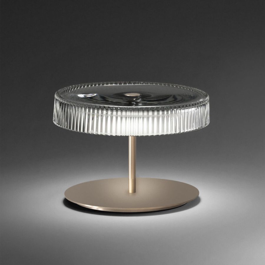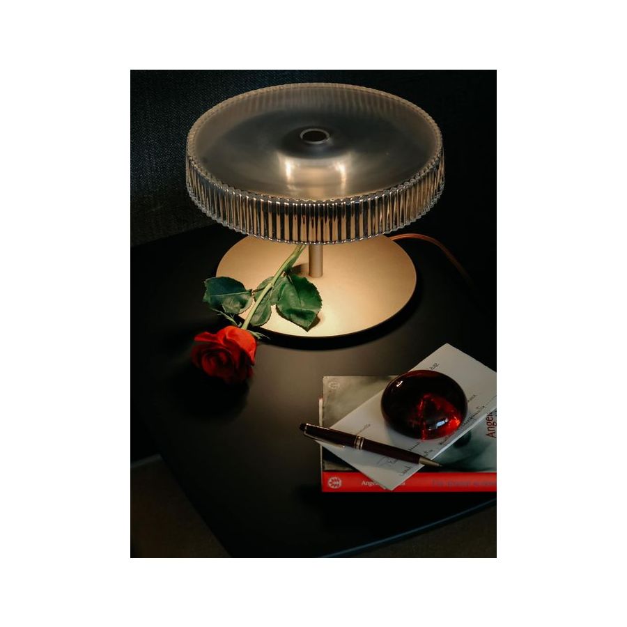 Table lamp with hand-curved crystal diffuser. Structure and metal details in satin corten or matt champagne finish.