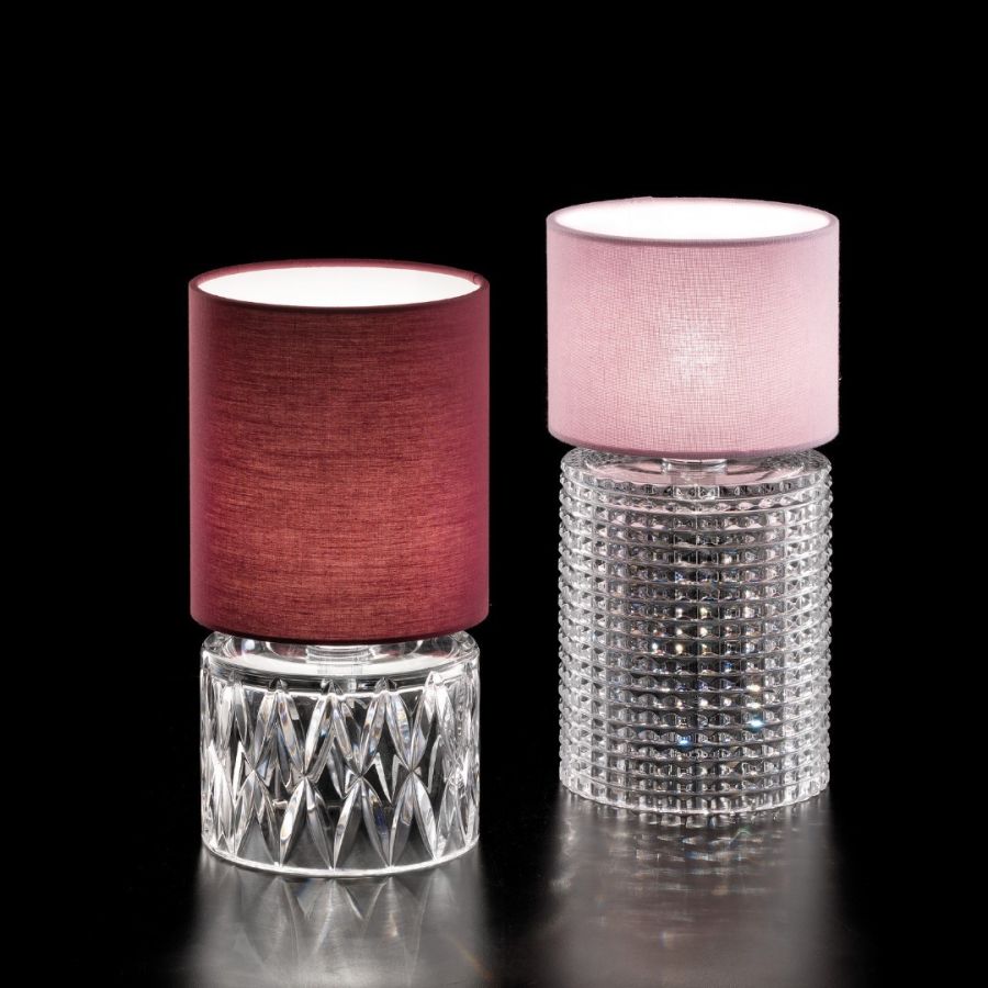 Table lamp in crystal with chrome metal details and pink or bordeaux fabric shade. Classic Catalogue Opera.